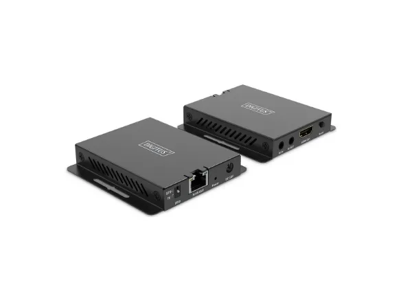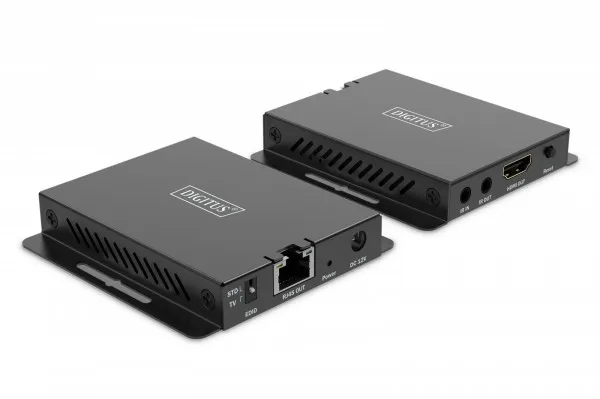 The DIGITUS video/audio extender kit includes both a transmitter and a receiver, making it an ideal solution for your connectivity needs. Compatible with a maximum video resolution of 4K, this device supports a V-Sync rate of 120 Hz, ensuring fluid video playback. Designed for flexibility, it can be mounted on a wall or used as a desktop unit, accommodating various setups while keeping your space organized. Built with a resilient metal housing, the device meets HDCP 2.3 compliance, ensuring secure content transmission. It features a status display and an easy-access reset button for user convenience. Enjoy HDR support and EDID Pass-Through for high-quality image transmission over distances up to 40 m, making this extender an efficient choice for both commercial and personal uses.