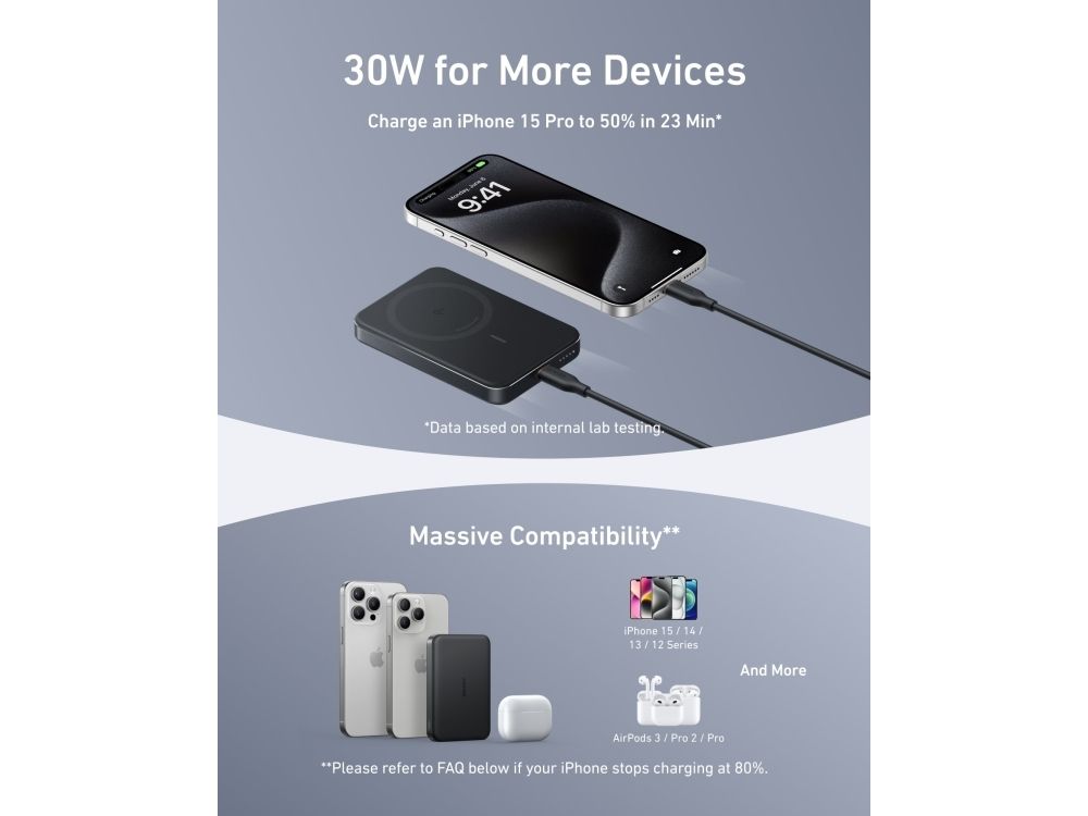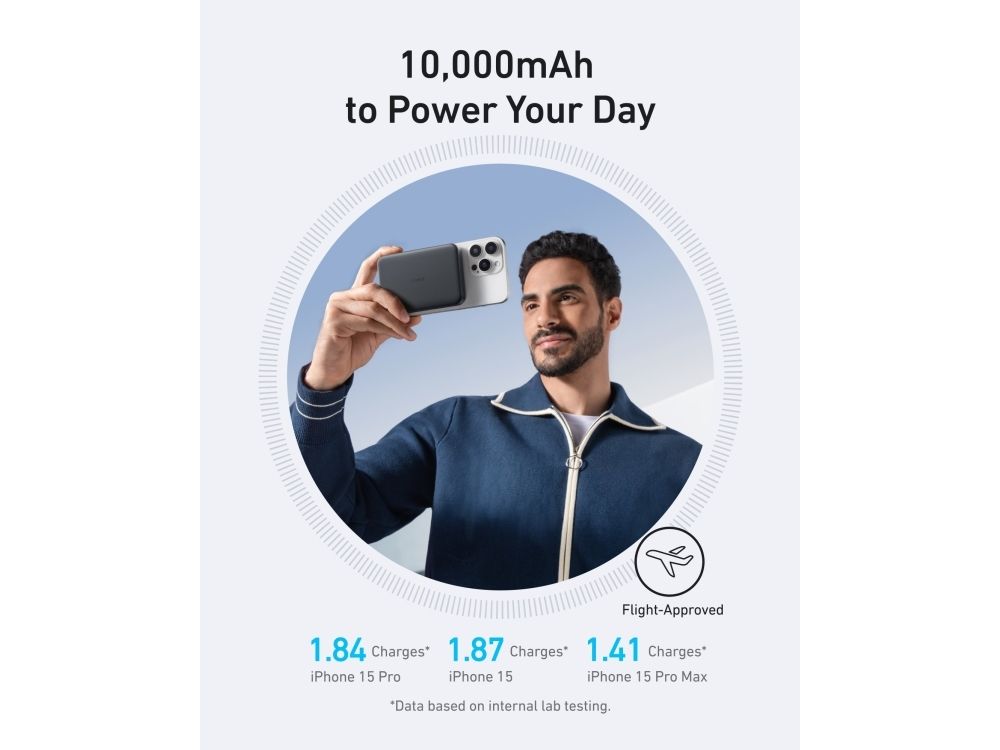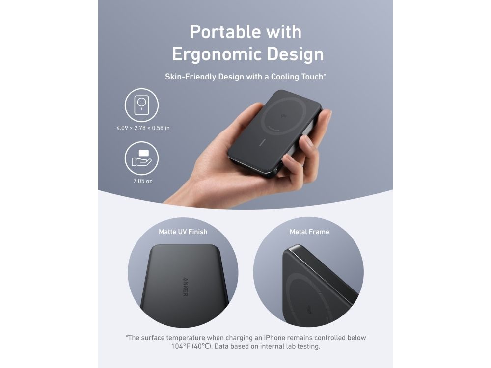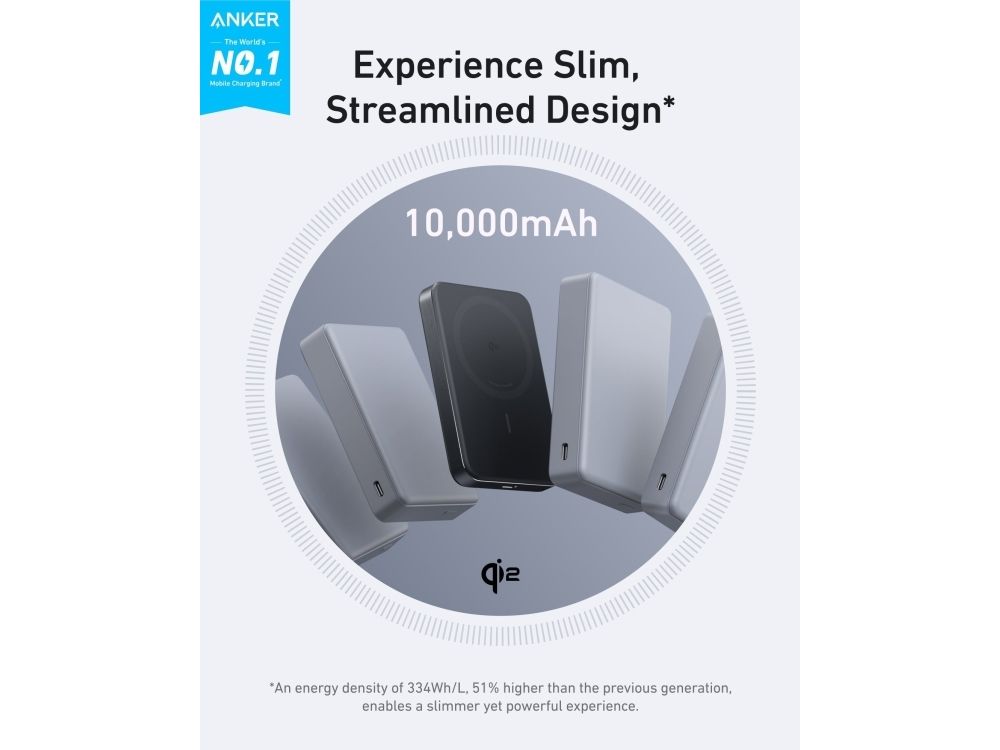 The Anker MagGo wireless power bank combines convenience and efficiency for charging on the go. Featuring a slim design, it is ideal for cellular phones and wireless earbuds. With a capacity of 10,000 mAh, this power bank can be recharged in 2.5 hours, ensuring that users can keep their devices powered with ease. Constructed with a metal frame and made from 75% recycled post-consumer content, this product is functional and environmentally conscious. It offers compatibility with MagSafe and supports PowerDelivery Technology, providing up to 30 watts for fast charging. The included 60 cm USB-C to USB-C cable enhances usability, making it a versatile choice for modern tech users.