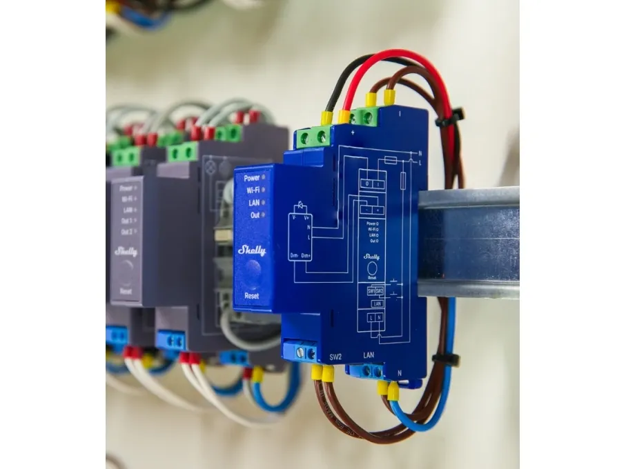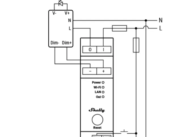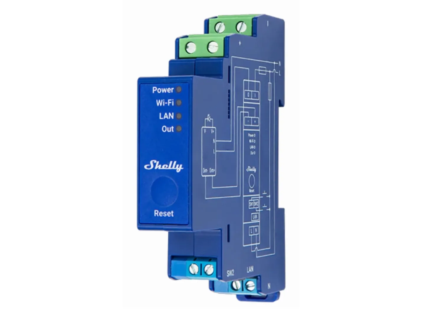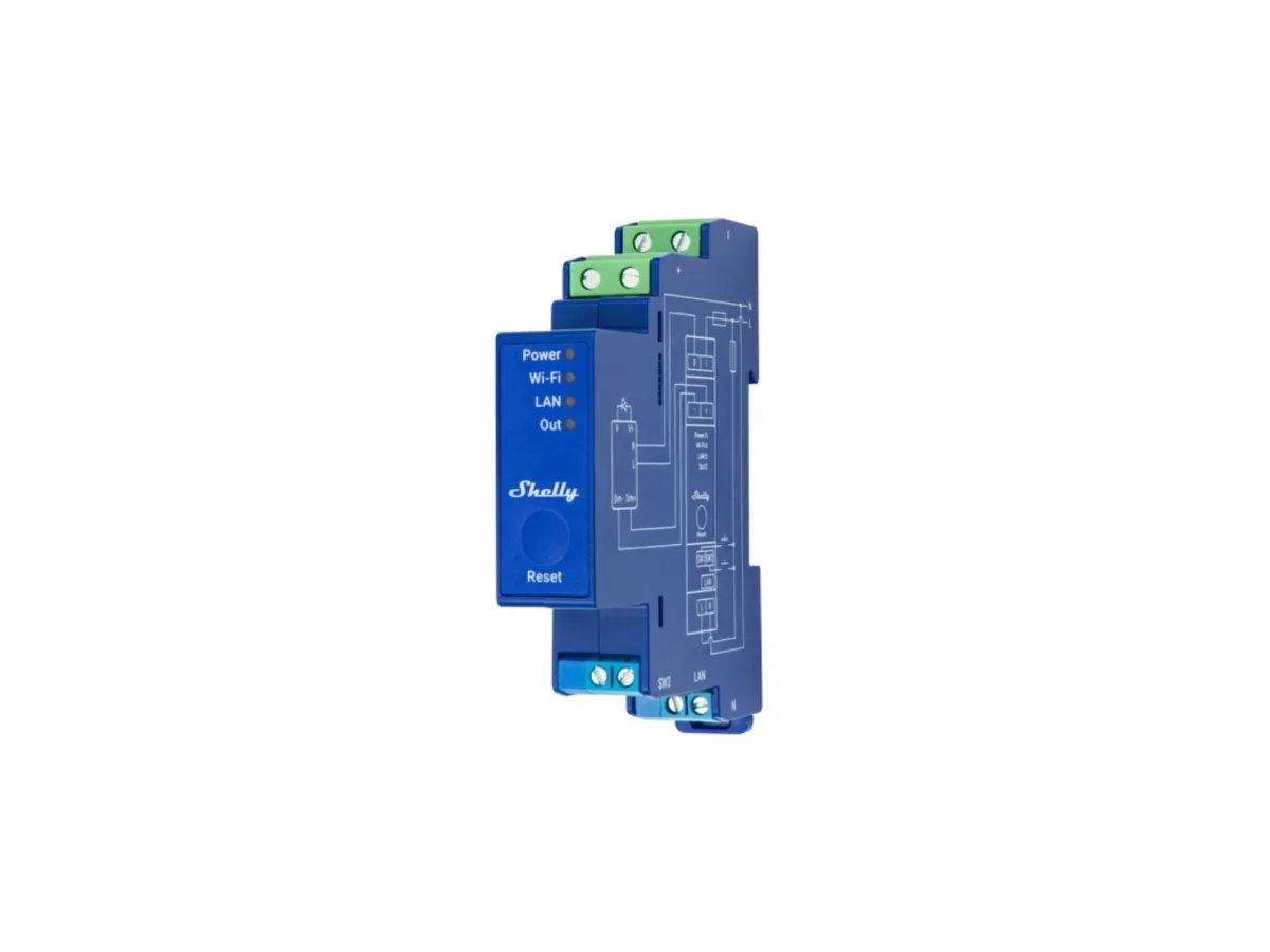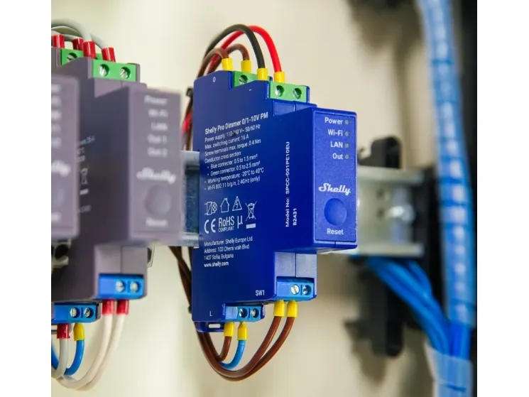 Shelly Pro Dimmer 0/1-10V PM is a WiFi-controlled 0/1-10V controller. The device is designed for controlling lighting, motors, valves, and similar applications. Shelly Pro Dimmer 0/1-10V PM operates in sourcing mode, meaning it generates its own 1-10V signal. The device also has a built-in relay for cut-off and power metering. Shelly Pro Dimmer 0/1-10V PM is easily set up and controlled through the Shelly Smart Control app or your preferred Smart Home or Smart Building system. Shelly devices work 100% locally and only require a local network to operate. Shelly can be used alone in the Shelly Smart Control app or with more than 200 partner systems such as Google Home, Amazon Alexa, Home Assistant, Samsung SmartThings, Athom Homey, KNX, and many more. Function Shelly Pro Dimmer 0/1-10V PM is primarily used for controlling 1-10V ballasts for lighting but is also suitable for regulating the speed of fans, motors, and similar devices. The device has two inputs for standard single-pole switches with and without spring return, allowing control via one- and two-button operation. The device supports night mode, so the light can automatically turn on at a lower brightness level at night. It is also possible to set minimum and maximum brightness, dimming speed, auto on/off timers, and much more. Connection Shelly Pro Dimmer 0/1-10V PM can connect to the internet or the local network through a LAN interface and/or 2.4 GHz WiFi. Additionally, the device has built-in Bluetooth like the rest of the Pro, Plus, and Gen3 devices, so it can also be used as a gateway for Shelly Bluetooth devices. The device works locally without connection to Shelly Cloud, but it is recommended to activate it for easy data storage and increased functionality. The device can also communicate via MQTT, HTTP, and WebSocket. All support TLS. Hardware The device is equipped with generation 2 hardware, which includes a powerful ESP32 processor. This allows for scripting functions for advanced and customized functionality as well as a range extender function with the device.