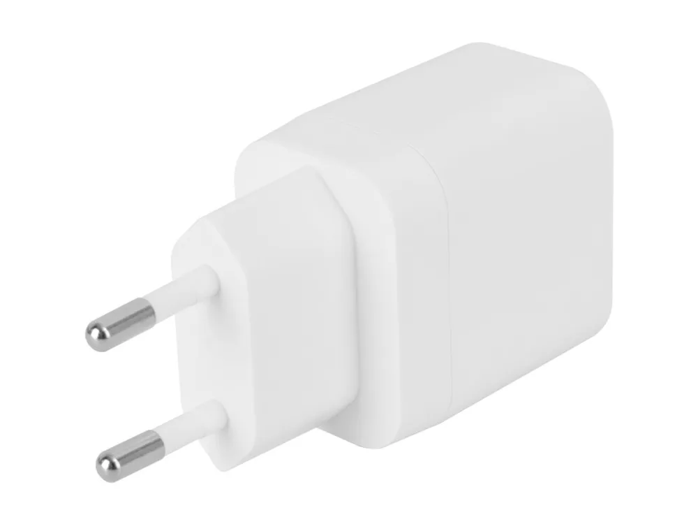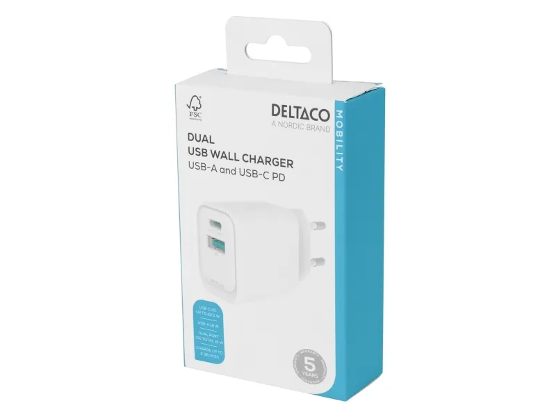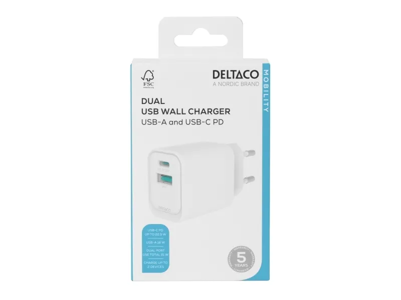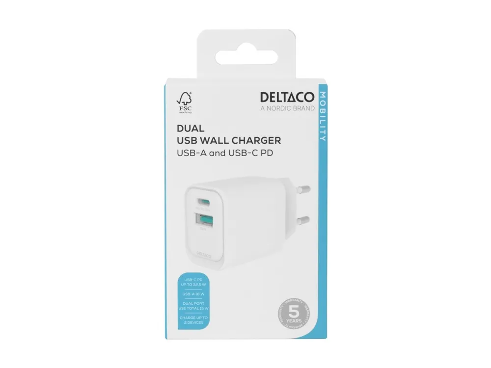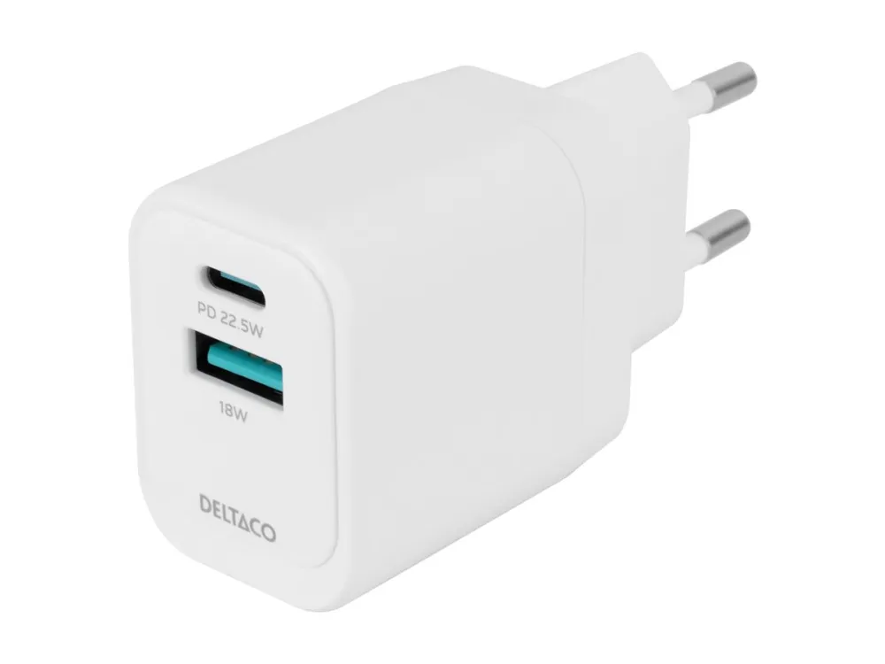 USB-väggladdare DELTACO, 1x USB-A 18 W, 1x USB-C PD 20 W, vit/ USBC-AC154 / 1903153