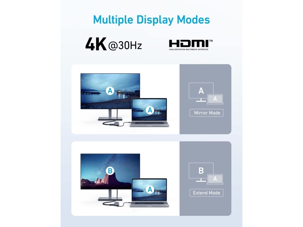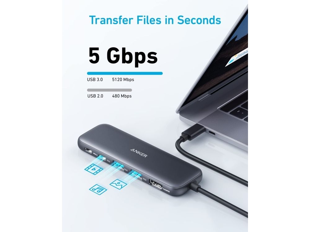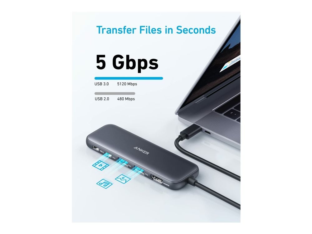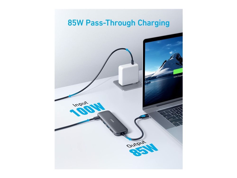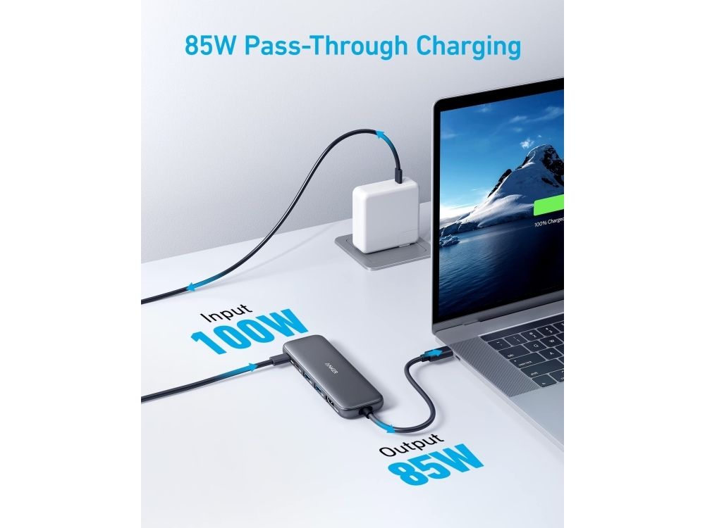 This is a multifunctional hub with 5-in-1 connectivity. It comes with a 4K HDMI port, a 5 Gbps USB-C data port, two 5 Gbps USB-A ports, and a 100 W PD-in port. The hub supports powerful pass-through charging up to 85 W, allowing you to charge your laptop while using it. However, a charger is not included. It also enables fast file transfer at speeds of up to 5 Gbps via the USB-C and USB-A data ports. Additionally, you can connect to the HDMI port to stream or mirror content to an external monitor with a maximum resolution of 4K at 30 Hz.