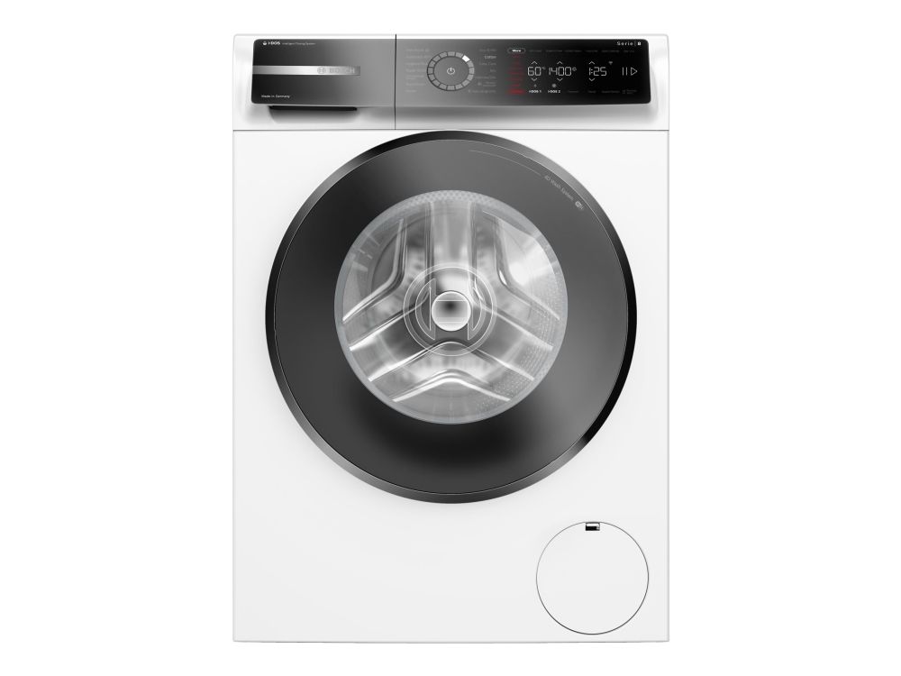 The Bosch Serie 8 WGB244A0SN washing machine offers efficient cleaning with a loading capacity of 9 kg, suitable for full, partial, or quarter loads. Its features include a VarioDrum design for gentle treatment of fabrics, a touch-sensitive control panel located on the front, and a range of special programs catering to various fabrics and cleaning needs such as SpeedPerfect and hygiene+. The Eco 40-60 program provides an energy-efficient wash while the ActiveWater Plus and AquaSensor ensure optimal resource usage with each cycle. Safety and convenience are prioritized with features like the child security lock, aquaStop water level protection, and anti-foam control. With a noise level of 70 dB(A) during spinning, it operates quietly and efficiently. The machine is IoT-compatible and equipped with Wi-Fi technology, allowing for remote monitoring and control through a smartphone, enhancing the user experience while providing compatibility with modern smart home systems.