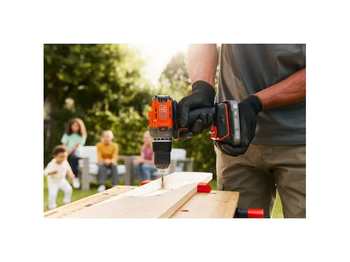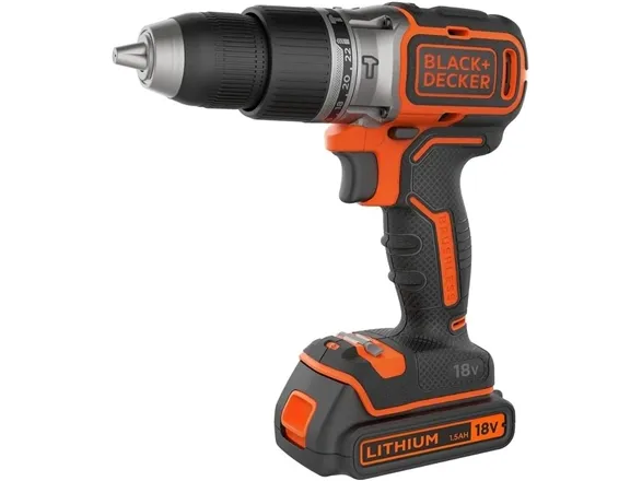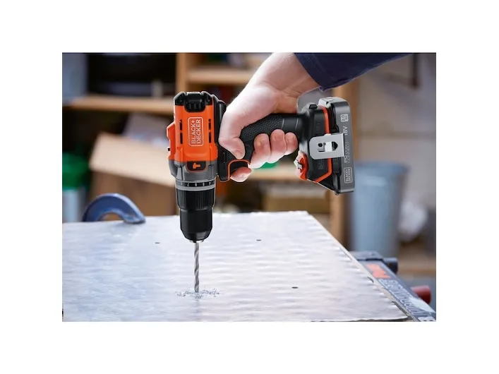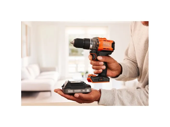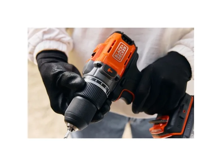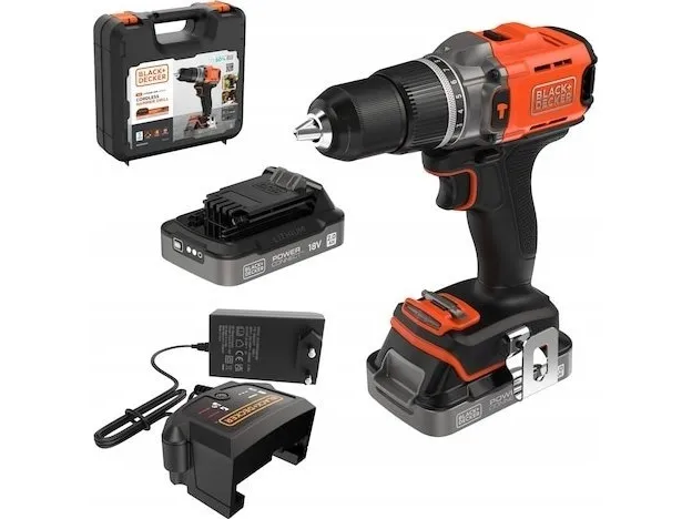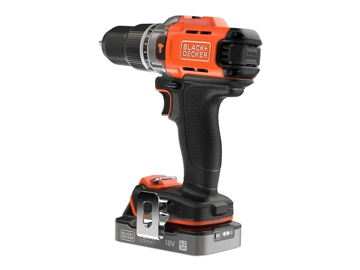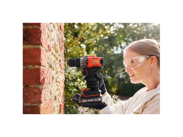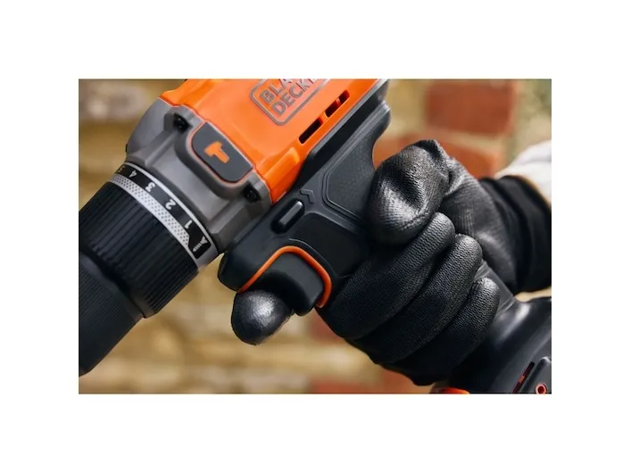 Product Overview The 18V Cordless Hammer Drill delivers the power you need without compromising on comfort or convenience. 45Nm max torque makes light work of drilling and screwdriving into wood, plastic and metal, while hammer action mode adds 24,000 beats per minute to power through tougher materials like concrete and masonry. Easily balance power and control to suit every task with 2 gear settings, a variable speed trigger, and 12 clutch positions. A keyless, single-sleeve chuck provides quick and easy bit changes, while the in-built LED light makes sure you never lose sight of the task at hand. Enjoy greater comfort and stability thanks to the ergonomic, soft-grip handle, with a detachable belt clip to keep your drill in easy reach. The orange tool housing is made with 50% recycled material from Tritan™ Renew*, helping support a sustainable planet. As part of the 18V POWERCONNECT™ system, the removable battery works with all BLACK+DECKER® 18V cordless tools**. This product is supplied with 2.0Ah State Of Charge Battery, 1A Charger and Kitbox. *Recycled material is certified through a third-party mass balance allocation process.Black & Decker BCD383D2XK-QW. Product design: Pistol grip drill, Product colour: Orange. Chuck capacity (max): 1.3 cm. Power source: Battery, Battery capacity: 2 Ah, Battery voltage: 18 V. Number of batteries included: 2 pc(s)