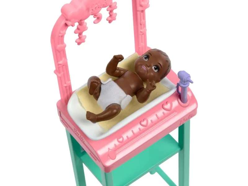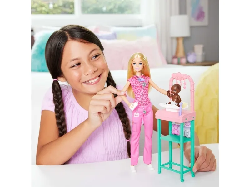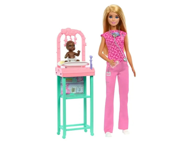 Kids can explore all kinds of career roles, including a Baby Doctor! This set includes a baby doctor environment including Barbie and her adorable baby doll patient! Barbie is wearing her pink heart print scrub set, ready to keep babies happy and healthy! The set also includes her examination table with Stars overhead and a shelf underneath to hold all the accessories, like a baby bottle or Barbie's stethoscope. Imaginations can play out a world full of storytelling possibilities and career opportunities with this powerful doll, ready to inspire kids to be anything! Doll cannot stand alone. Colors and decorations may vary.