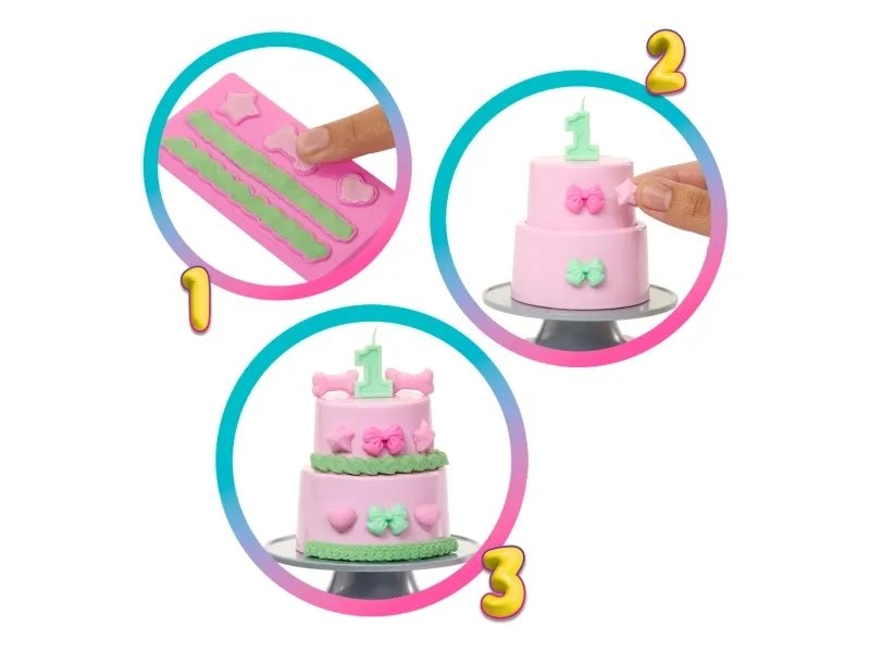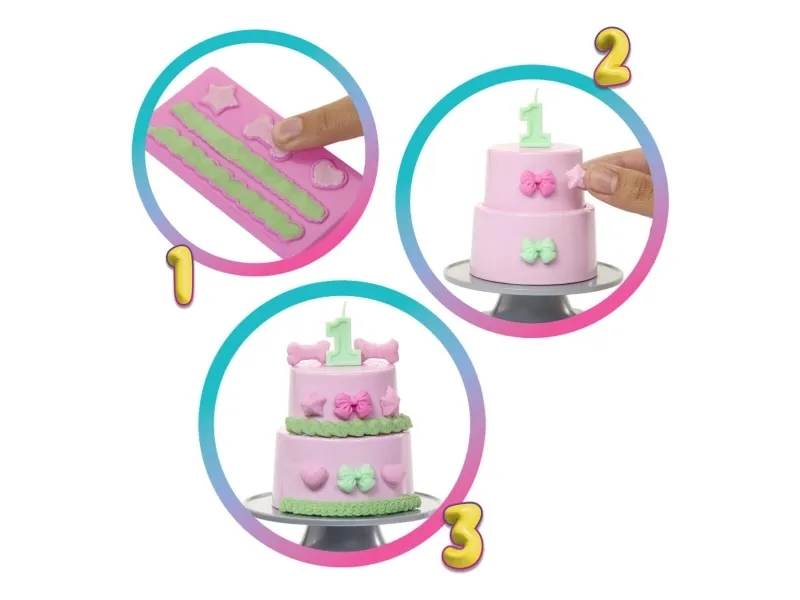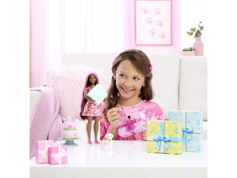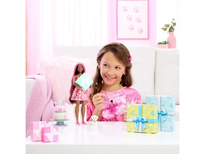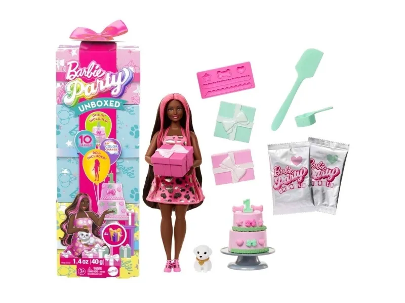 With 10 surprises in one package, Barbie Party Unboxed dolls deliver a unique unboxing experience with gift box-inspired packaging and pet birthday-themed fun! There are three dolls to collect: Birthday Bows, Shimmerin' Hearts or Party Stars. Which doll will you reveal? Keep 'unwrapping' the presents to find party fashions, an adorable pet with dress-up accessory and cake decorating tools. Young creatives can use the easy mix-and-make dough compound, mold tray and tools to make decorations for the included two-tier birthday cake and throw a pet birthday party. More surprises include colour-change on the doll's face and pet -- simply use icy cold and warm water to transform, change back and repeat again and again! Kids will love discovering the party inside this Barbie Party Unboxed Pet Birthday series and can collect them all to keep the party surprises going! Each doll sold separately, subject to availability. Dolls cannot stand alone. Colours and decorations may vary.Barbie Party Unboxed Pet Birthday Series Doll & Accessories, Shimmerin’ Hearts Set with 10 Surprises. Doll type: Fashion doll, Doll's gender: Female, Recommended age (min): 3 yr(s). Height: 138 mm, Weight: 280 g. Material: Fabric, Plastic, Product colour: Multicolour