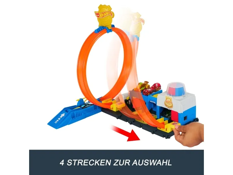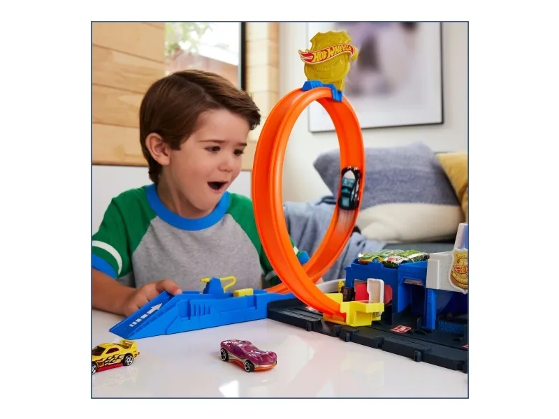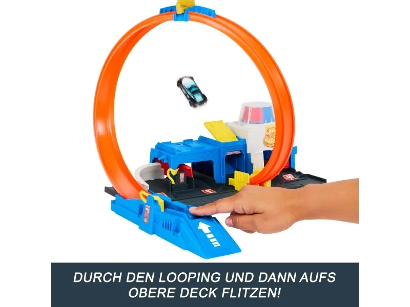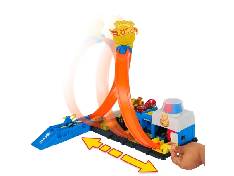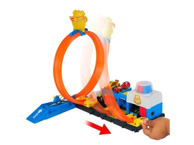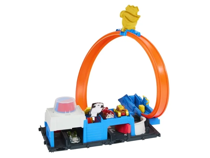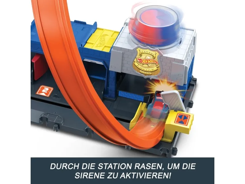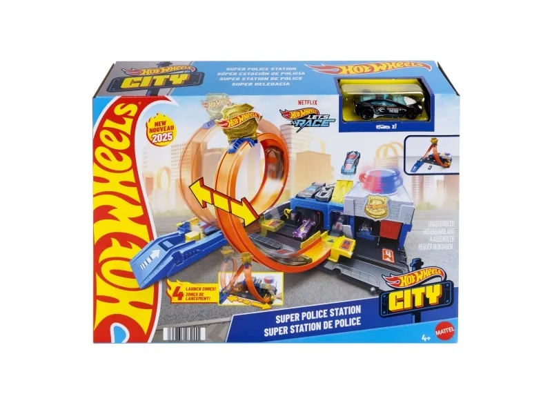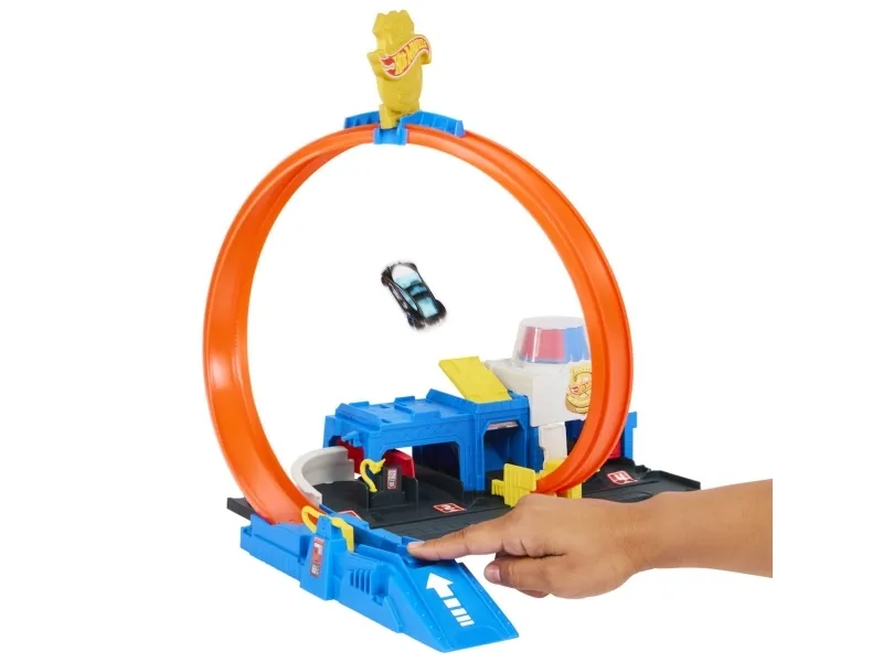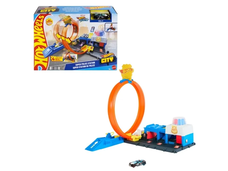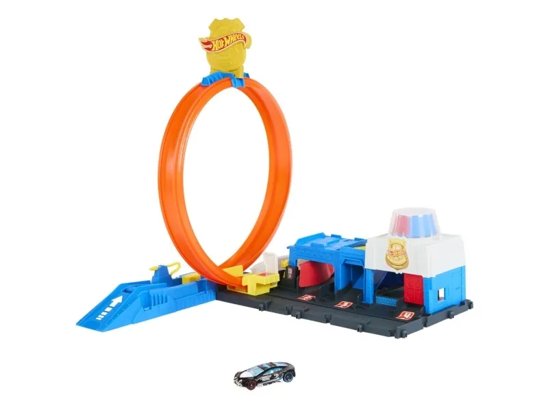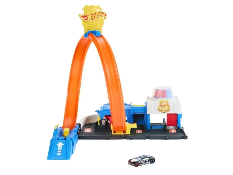 There are four different ways to race and stunt through the Hot Wheels City Super Police Station playset with its adjustable track! Drive the included 1:64 scale die-cast toy police car into the launcher where there's a flex hose to refuel before heading into action. Slide the loop-track to one of four paths – each one showcases a different stunt or outcome. Park up to four vehicles on the set and attach other tracks and playsets for open-ended play. One car is included; additional vehicles and tracks sold separately. Colors and decorations may vary,