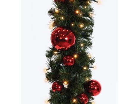 Granljusslinga med röda kulor och varmt ljus, 700 cm / 87 kulor