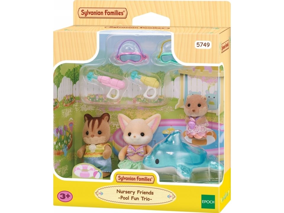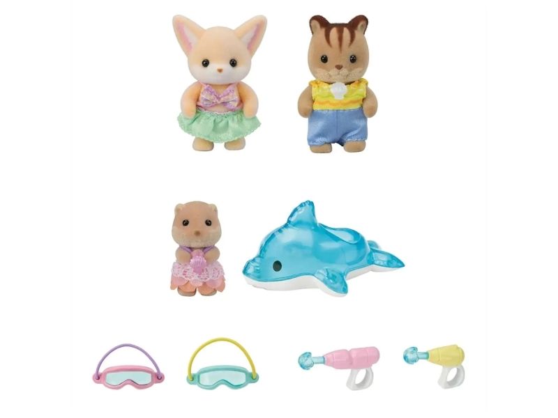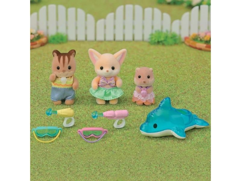 Setet Trillingarna vid simbassäng har 3 bebisar: fennekbebisen Yulie, ekorrbebisen Ambrose och utterbebisen Nicola samt tillbehör för simleker. Den uppblåsbara delfinen är mycket rolig: barnen kan rida på den! Bebisarna har på sig söta baddräkter med vågmönster och skalknappar. Barnen kan hålla i händerna poolleksakerna och bära glasögonen. Kombinera med andra Sylvanian leksaker. Lämplig för åldrarna 3+.