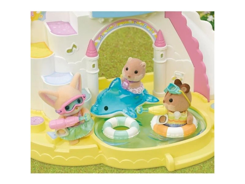 3 bebisar med tillbehör för lek vid simbassäng;uppblåsbar delfin att rida på;kombinera med andra Sylvanian leksaker;passar för åldrar 3+;