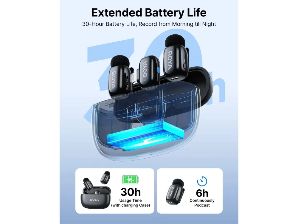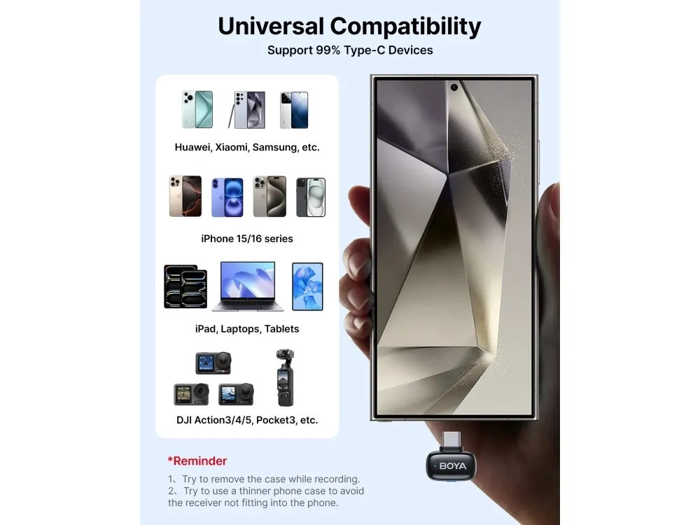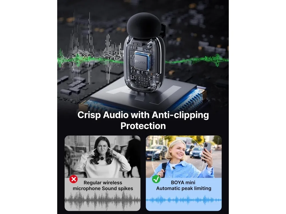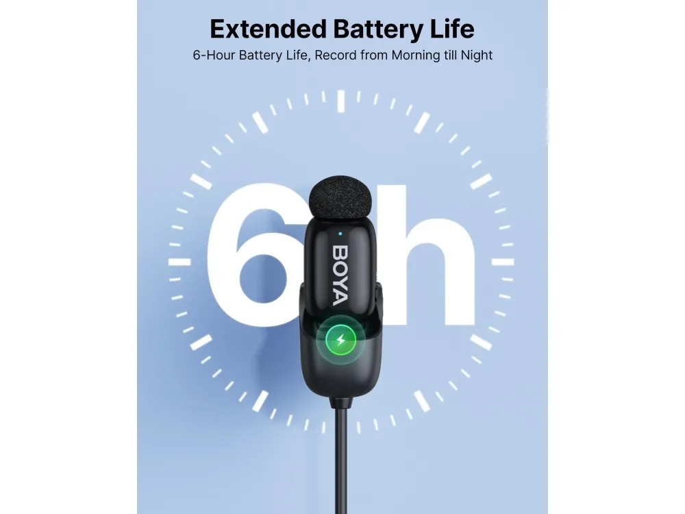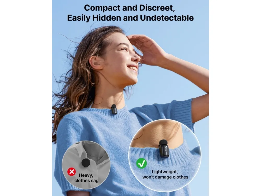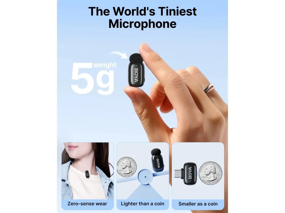 The BOYA mini is a condenser lavalier microphone designed for high-quality audio performance in a compact form factor. With a frequency response of 20 - 20,000 Hz, it captures a wide range of sounds, ensuring clarity and professional sound quality. Operating in mono mode, this wireless microphone system provides convenience and freedom of movement, making it ideal for interviews, presentations, and other applications where mobility is essential. Equipped with noise-canceling technology, the BOYA mini effectively minimizes background noise, allowing for a focused audio experience. With a maximum sound pressure level of 120 dB and a signal-to-noise ratio of 80 dB, it delivers clear, crisp audio with minimal interference. The device boasts an impressive max operating distance of 100 m, ensuring you can record or transmit audio without being tethered to your device, providing users with flexibility during use.