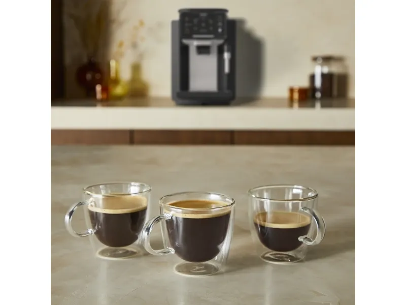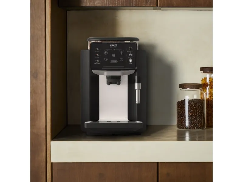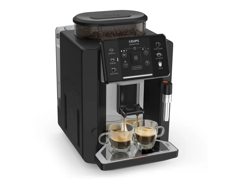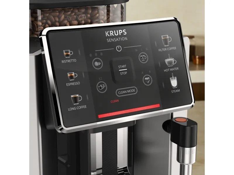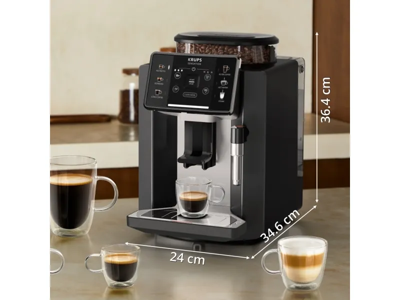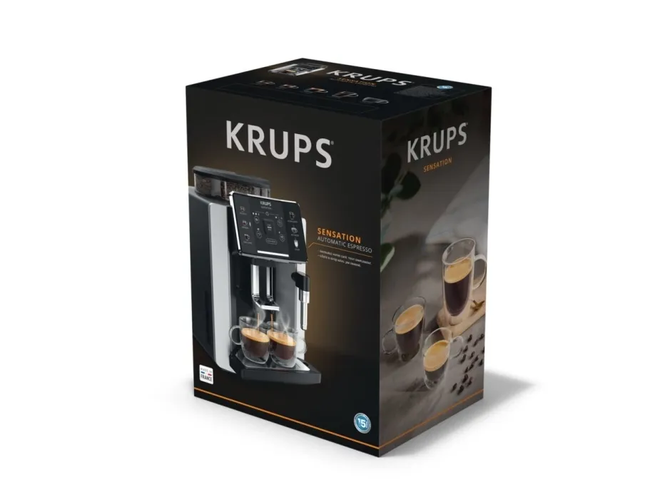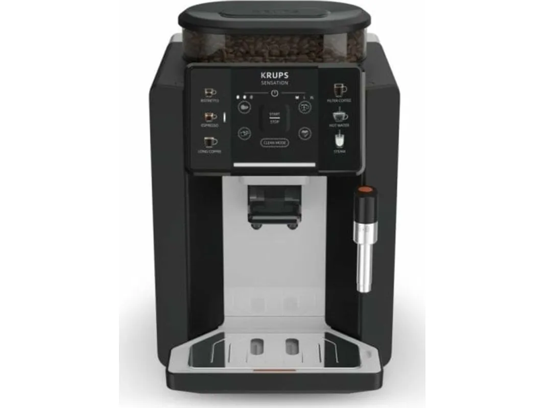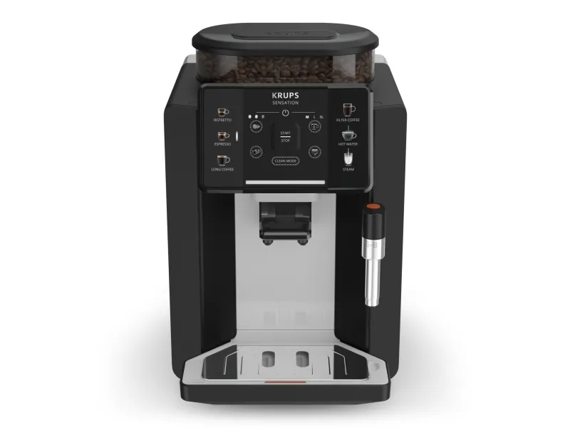 Krups Sensation EA910A. Product type: Espresso machine, Coffee maker type: Fully-auto, Water tank capacity: 1.7 L, Coffee input type: Coffee beans, Reservoir for brewed coffee: Cup, Number of spouts: 2, Built-in grinder. Power: 1450 W. Product colour: Black, Chrome