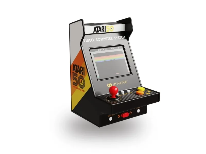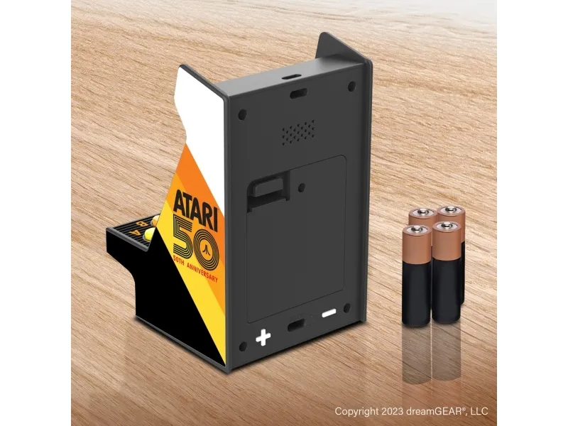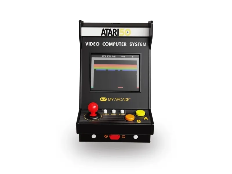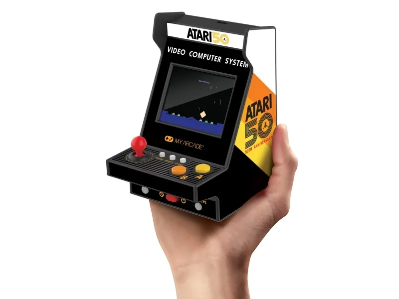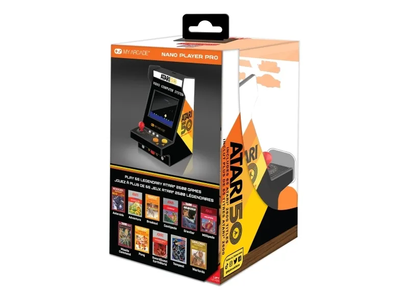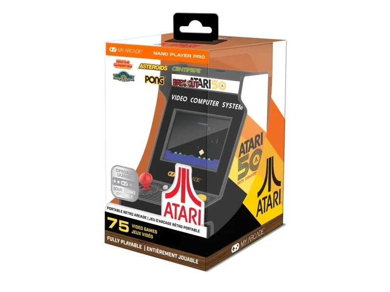 Atari® is a pioneer in the video game industry, responsible for some of the most iconic games of all time, including PONG®, Breakout®, and Asteroids®. Atari was founded in 1972 and, with a rich history that spans over 50 years, is one of the oldest video game companies in the world. With its focus on innovative gameplay and cutting-edge technology, Atari has always been at the forefront of the gaming industry.My Arcade Atari Nano Player Pro. Product colour: Multicolour, Gaming control function buttons: Home button, Select button, Start button. Display: LCD, Display diagonal: 6.1 cm (2.4"). Power source type: USB/Battery, Battery type: AAA, Battery technology: Alkaline