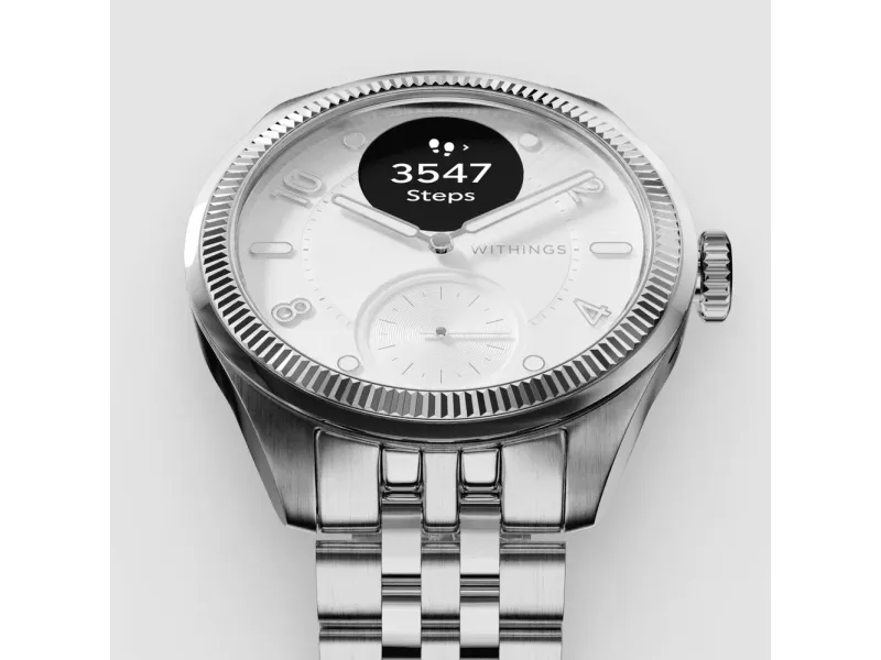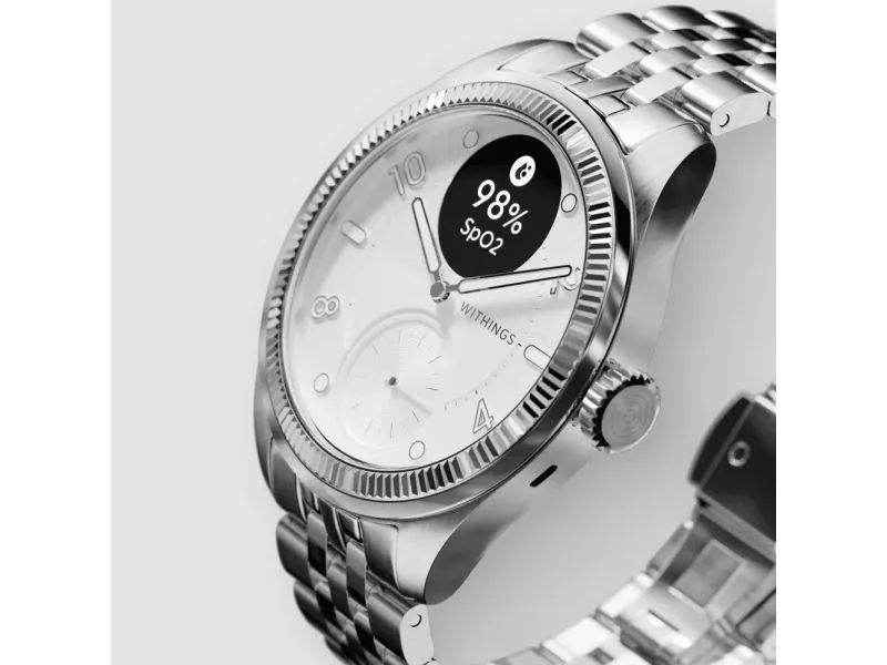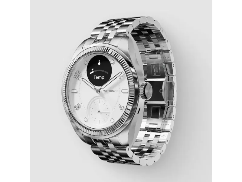 Withings ScanWatch Nova kombinerar sofistikerad design med funktioner för övervakning av hälsa och kondition. Denna hybrid-smartklocka har en hållbar boett i rostfritt stål och en keramisk/rostfritt stålram, skyddad av safirglas, vilket garanterar lång livslängd och stil. Oyster Metal-armbandet med vikspänne ger en säker och justerbar passform för komfort hela dagen.