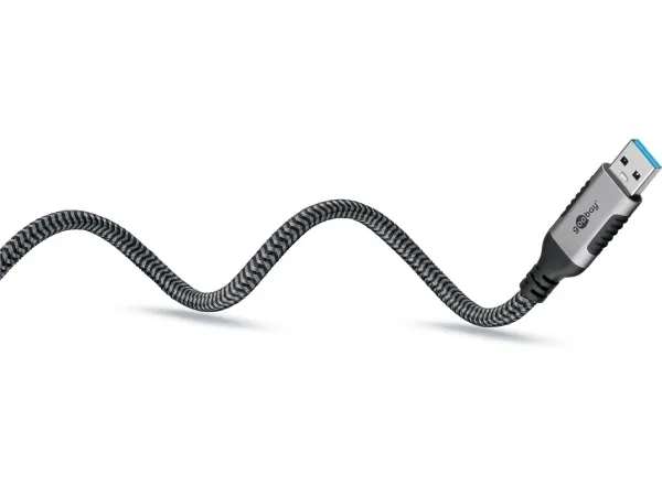 USB-kabelns flätade, slitstarka textilhölje har en behaglig känsla och är skonsamt mot känsliga ytor