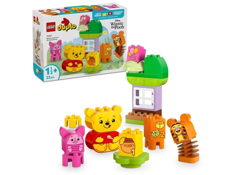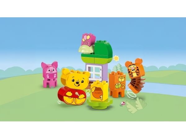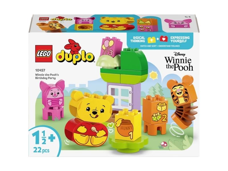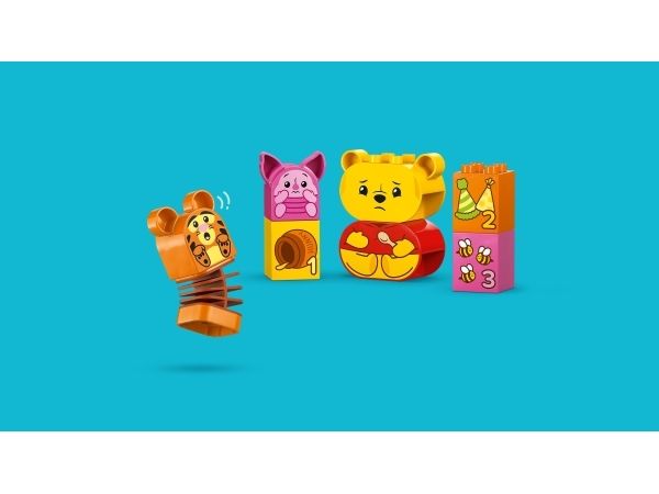 Förskolebarn låtsas gå på kalas med de 3 LEGO DUPLO figurerna: Nalle Puh, Tiger och Nasse. Varje karaktär har ett dubbelsidigt ansikte med olika uttryck, vilket sätter igång oändliga kreativa lekar och berättelser. Denna roliga funktion främjar även små barns sociala och känslomässiga lärande när de utforskar olika känslor som barn kan känna på kalas, från glädjen i att öppna presenter till obehag efter att ha ätit för mycket godis!