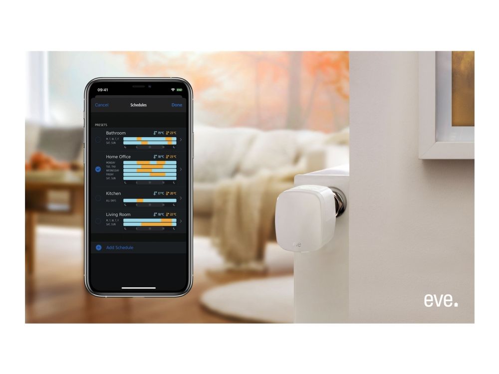 Ställ in den perfekta temperaturen i varje rum för ditt välbefinnande och för att få en god natts sömn. Ställ in sovrummet på 17 grader, vardagsrummet på 21 grader och låt badrummet värmas upp till 22 grader så att du är redo på morgonen - allt är möjligt med Eve Thermo.