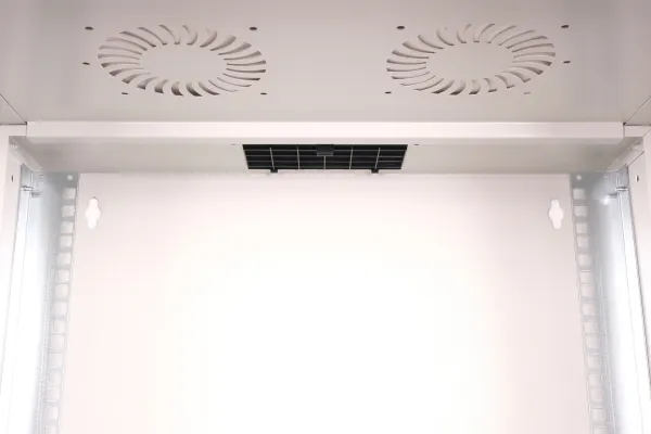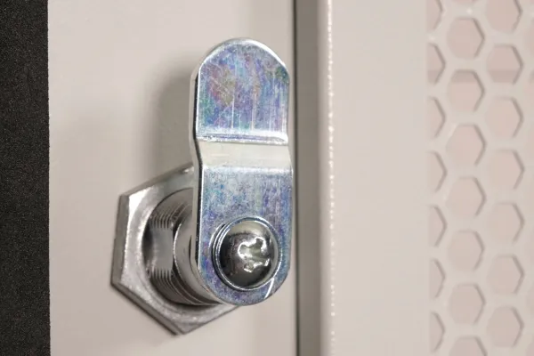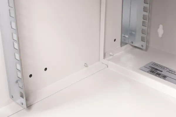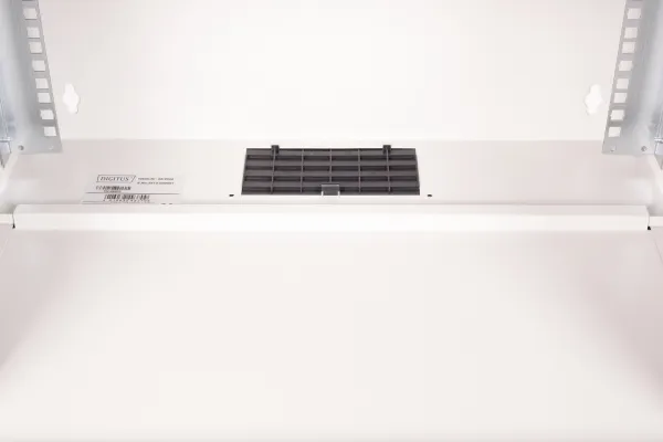 Perforerad framdörr, 200° dörröppning, låsbar dörr, galvaniserade skenor, skenor, justerbara i djupled, övre och undre kabelingångspunkter, kabelingång med plastlock, passiv ventilering, 1,5 mm stålplåt