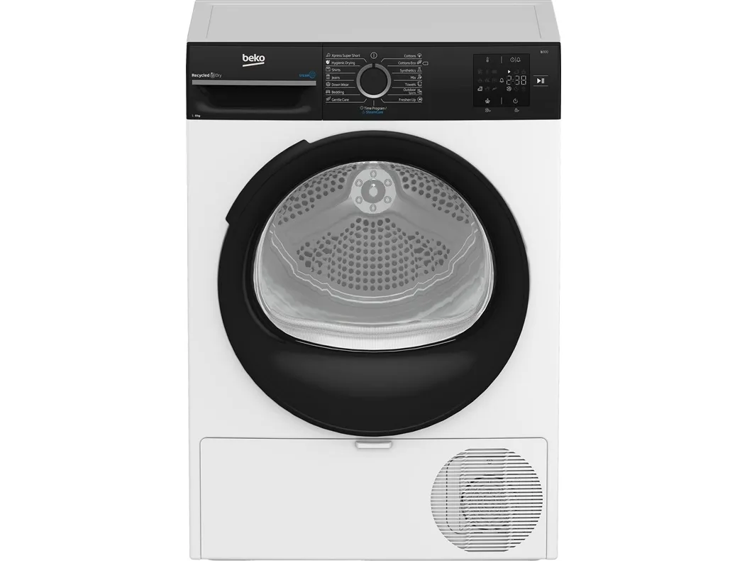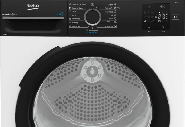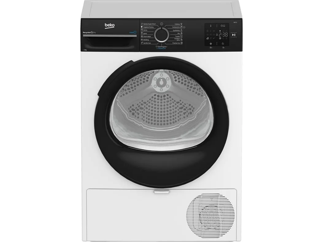 Brand- Beko. Model- BM3T38239WBB . Width- 59.8 cm. Depth- 47 cm. Height- 84.6 cm. Colour- White. Weight- 39.5 kg. Drum capacity- 8 kg. Energy Efficiency Class- D. Type of drying- Condensing with heat pump. Annual energy consumption- 220.2 kWh. Drying efficiency class- B. Number of applications- 15. Noise level- 64 - 64dB. Drying programs- Programs: Cottons, Cotton Eco Dry, Synthetics, Mix (Daily), Towel, Outdoor/Sports, Freshen up, Time programmes, GentleCare, Bedding, Down Wear, Jeans, Shirts, Hygienic Drying, Xpress Super Short. Control- Electronic. Screen- Yes. Mandatory warranty- 24 mo.