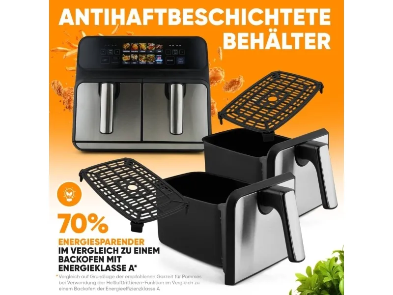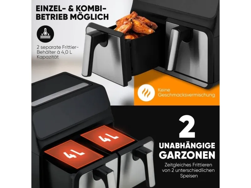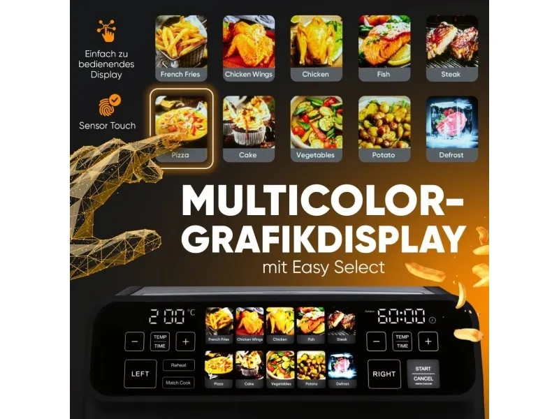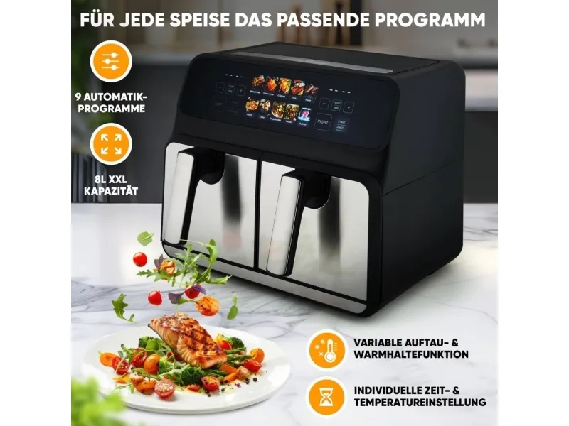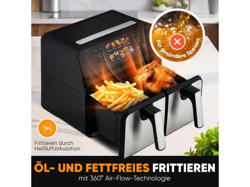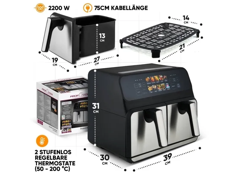 ProfiCook PC-FR 1287 H. Product type: Hot air fryer, Capacity: 8 L, Temperature (min): 50 °C. Construction type: Double, Product colour: Black, Stainless steel, Control type: Touch. Display type: LED. Power: 2200 W, AC input voltage: 220 - 240 V, AC input frequency: 50/60 Hz. Width: 400 mm, Depth: 345 mm, Height: 325 mm