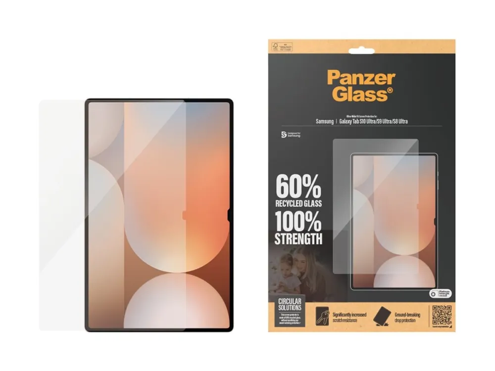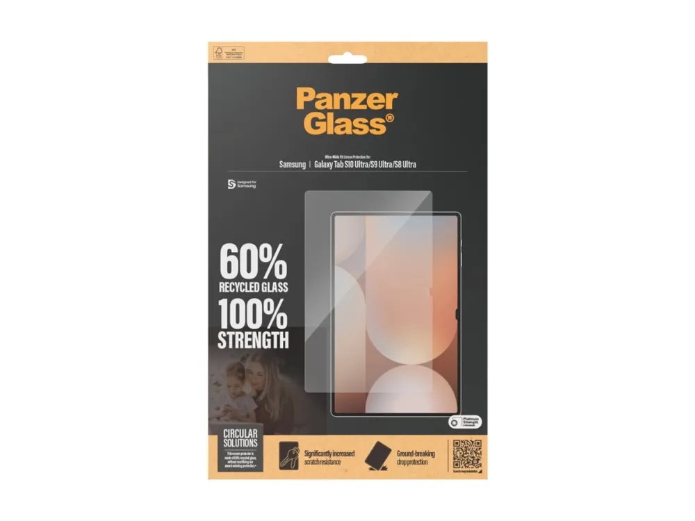 Introducing our PanzerGlass screen protector, made of 60% glass. Kids love their tabelts – dropping, banging, scratching and bumping them as they go. That is just everyday life. And that is just what this PanzerGlass screen protector is made for: protecting your tabelt from the hazards of everyday life. Accidental bumps against sharp-edged table corners or crushing falls onto stone-hard floors are no match for its scratch and shock-resistant layers.  The screen protector is easy to apply and once installed, you'll never again fear the sight of your tabelt slipping from your kid's fingers and tumbling to the ground. This may never happen, but if it does, you'll regret not having clicked "add to cart". The Ultra-Wide Fit screen protector covers the entire front surface of your tablet, while still leaving room for a case. It provides a complete and crystal-clear view of your screen and comes in FSC-certified packaging that can be recycled. The PanzerGlass screen protector. Tested by kids. Approved by parents.