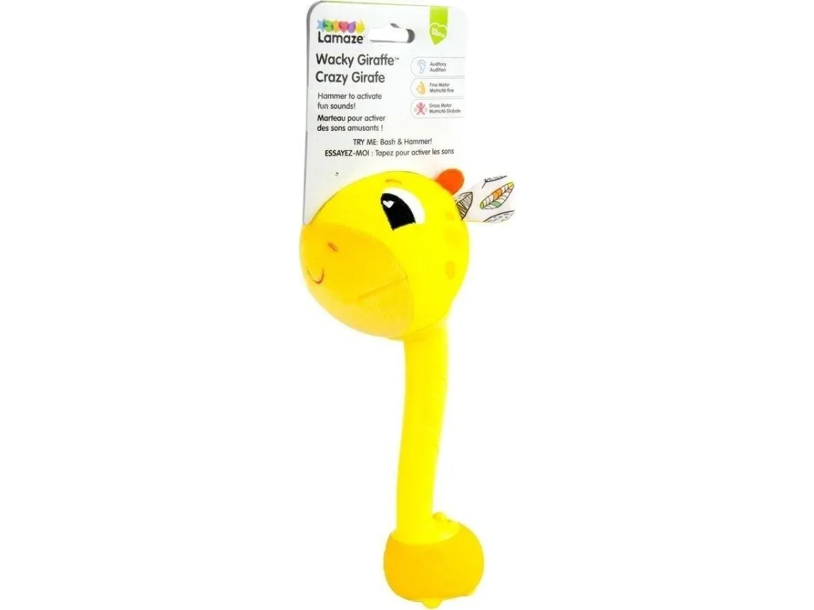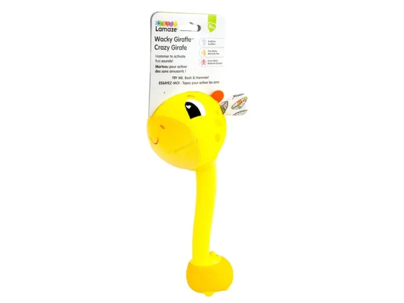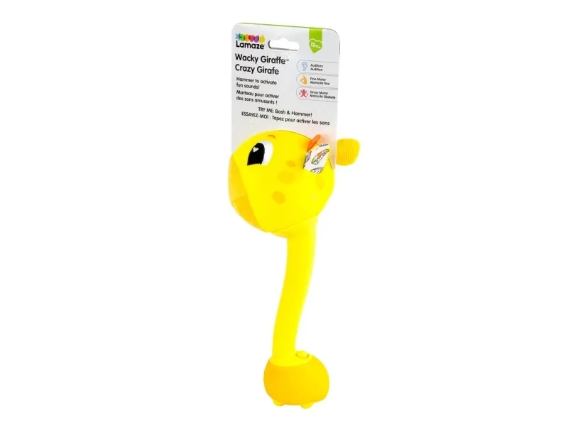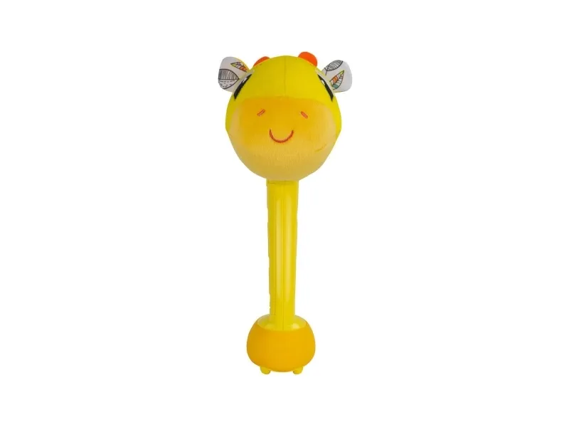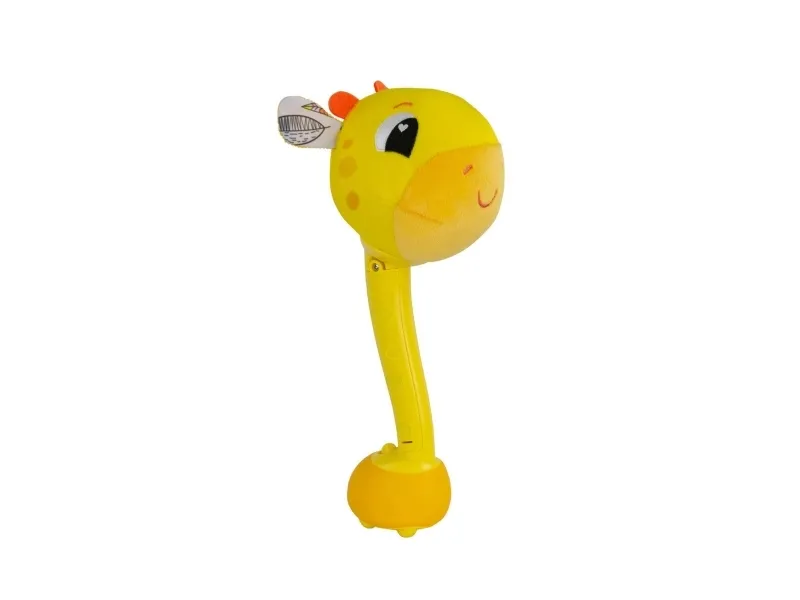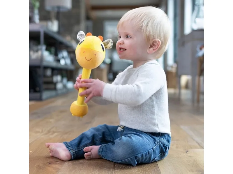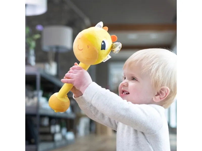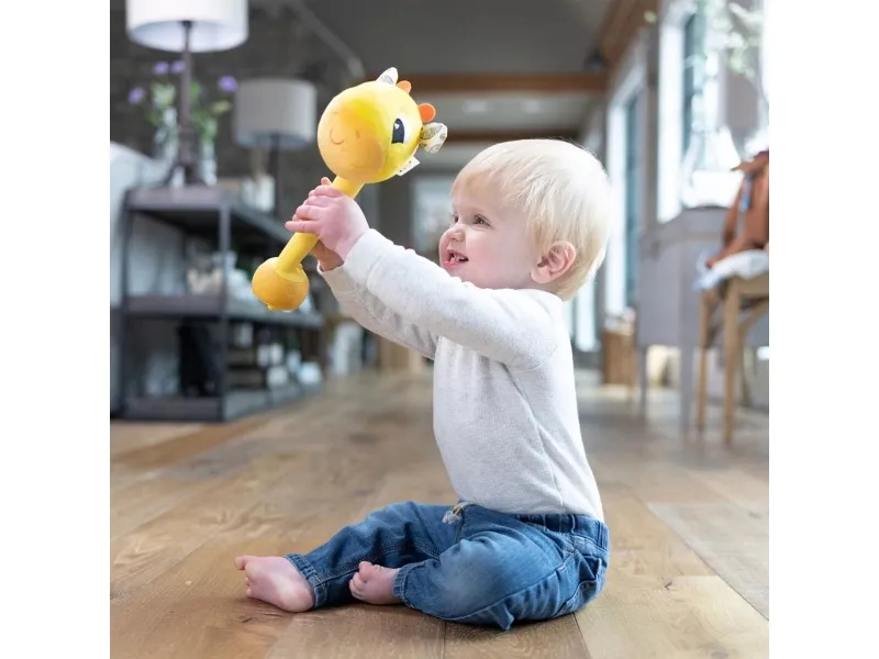 Sist men inte minst en leksak som babyn kan svänga med och slå på! Med ett lyckligt plyschgiraffhuvud i ena änden och en mjuk säker bas i den andra kan små barn svänga denna unika sensoriska leksak och slå på saker utan att det ställer till någon skada. Och med varje slag hör barnen ännu ett roligt och ovanligt ljud! (Oroa dig inte, den har en avstängningsknapp också.) Möt ”slagfasen” direkt med ett vänligt ansikte och massor av skratt.