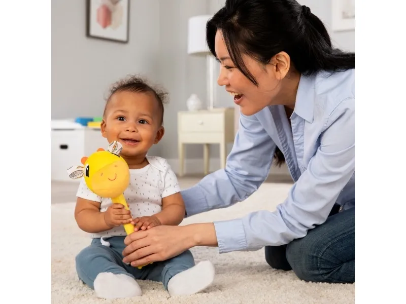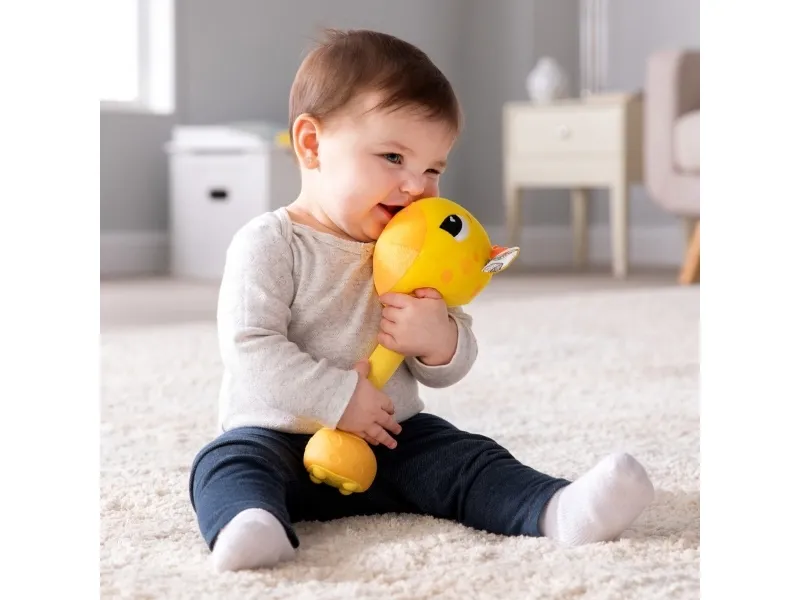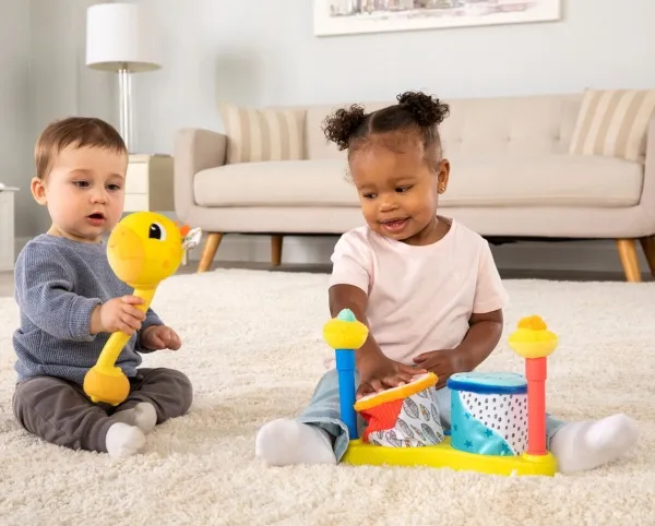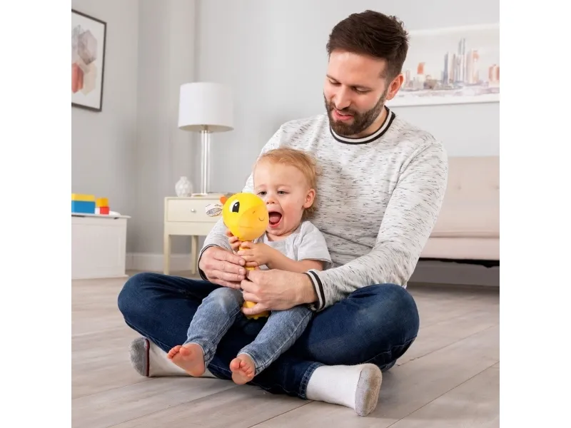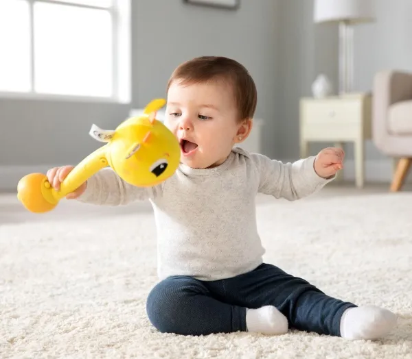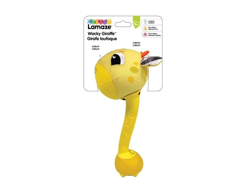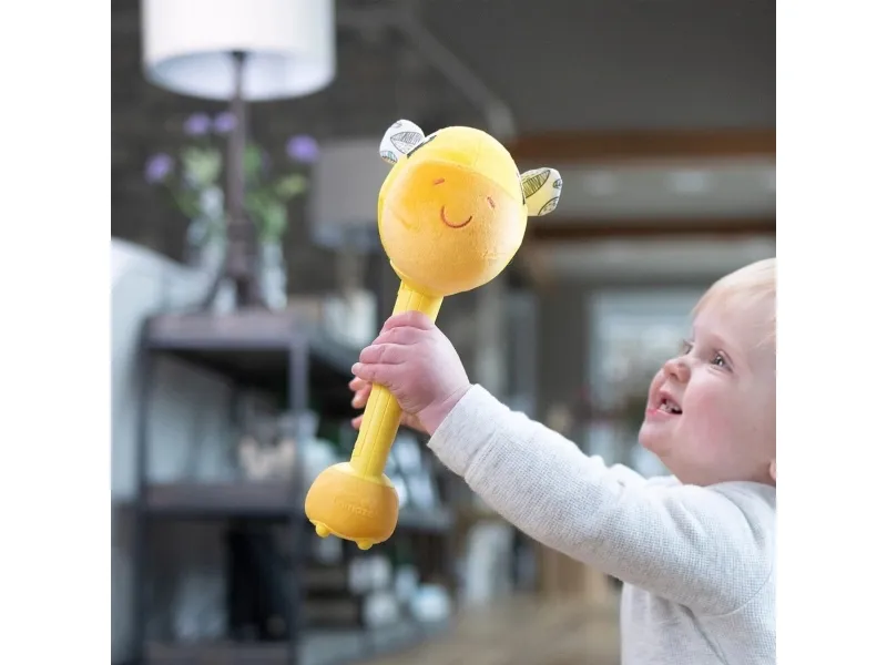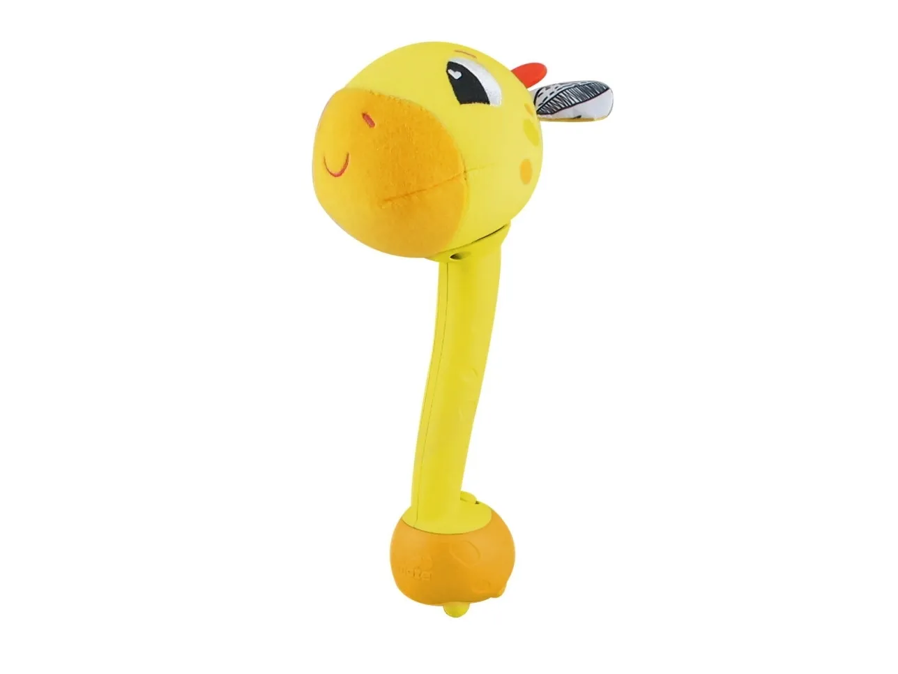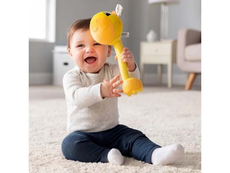 Sist men inte minst en leksak som babyn kan svänga med och slå på! Med ett lyckligt plyschgiraffhuvud i ena änden och en mjuk säker bas i den andra kan små barn svänga denna unika sensoriska leksak och slå på saker utan att det ställer till någon skada. Och med varje slag hör barnen ännu ett roligt och ovanligt ljud! (Oroa dig inte, den har en avstängningsknapp också.) Möt ”slagfasen” direkt med ett vänligt ansikte och massor av skratt.