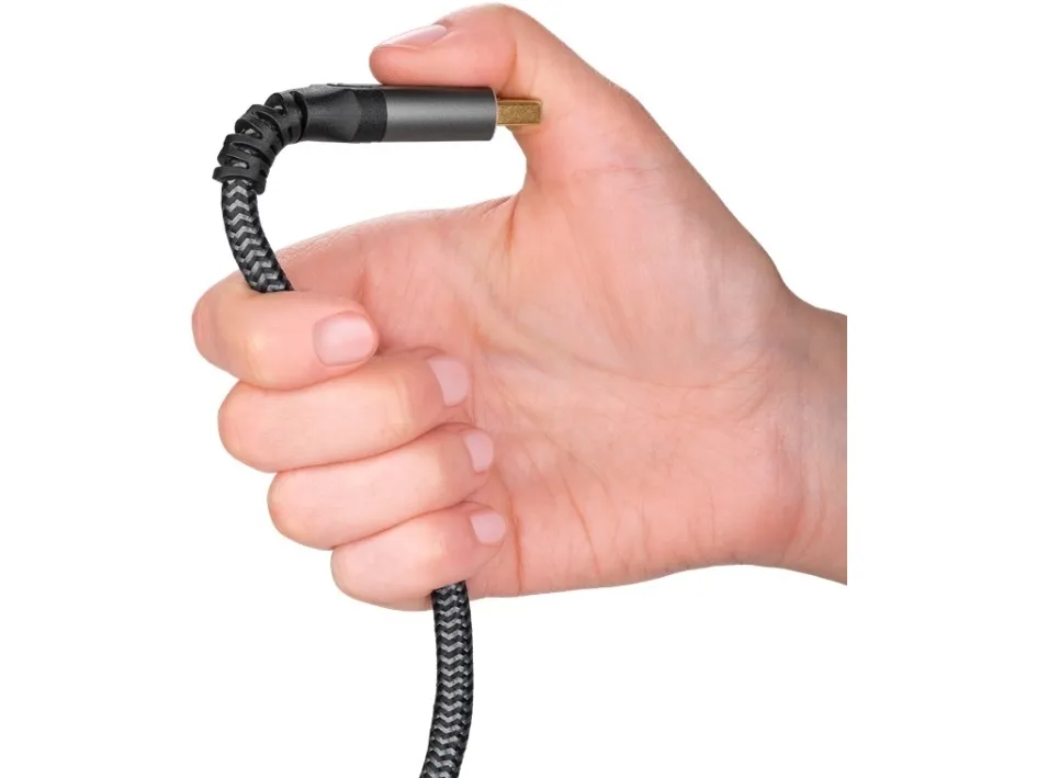 Flexibel premiumkabel med smala metallkontakter, böjskydd och färgmatchad textilkabel