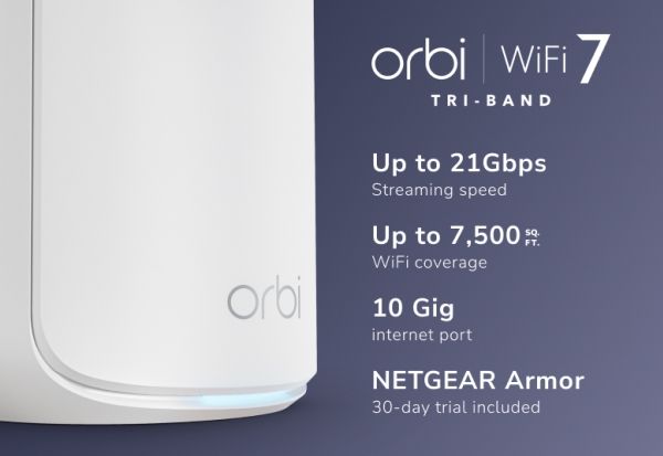 NETGEAR Orbi 870 Series RBE873 - Wifi-system - (router, 2 förstärkare) - upp till 9000 kvadratfot - mesh 10GbE, 2.5GbE, Wi-Fi 7 flera band