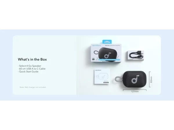 Brand- Soundcore. Operation time (Fully charged)- 12 h. The power of sound- 5 W. Bluetooth interface- Yes. WiFi interface- No. Hands-free function- Yes. Mandatory warranty- 24 mo. Width- 121 mm. Depth- 48.5 mm. Height- 83 mm. Colour- Black. Power supply- Battery. Form- Square. Connections- Bluetooth, 1 x USB-C. Radio receiver- None. Warranty for legal entities- 12 mo.