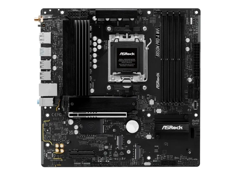 The ASRock B850M Pro-A WIFI motherboard is designed to elevate your computing experience with its robust features and modern connectivity options. Built on a micro ATX form factor, it supports AMD Ryzen processors, ensuring compatibility with high-performance computing setups. The motherboard supports DDR5 SDRAM technology, with speeds up to 4000 MHz (O.C.), allowing for efficient multitasking and high-speed data processing. Additionally, it facilitates up to 4 DIMM slots for memory expansion, making it a suitable choice for gamers and professionals alike. Offering various connectivity options, this motherboard includes multiple USB ports, including USB 3.2 Gen 2 and USB-C 3.2 Gen 2, along with HDMI and DisplayPort for versatile display output. The inclusion of a 2.5 Gigabit Ethernet port ensures swift and reliable network connections. With high definition audio capabilities powered by Realtek ALC897, sound quality enhances your gaming or media experience.