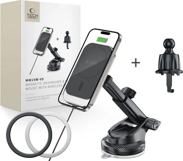 TECH-PROTECT MM15W-V9 MAGNETIC MAGSAFE DASHBOARD & VENT CAR MOUNT WIRELESS CHARGER 15W BLACK