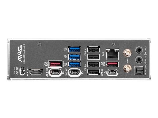 1 x HDMI 4 x USB 2.0 3 x USB 3.2 Gen 1 2 x USB 3.2 Gen 2 1 x USB-C 3.2 Gen 2 2 x USB4 2 x antenn 1 x SPDIF-utgång 1 x ljudutgång - mini-jack 1 x mikrofon - mini-jack 1 x LAN (5Gigabit Ethernet)