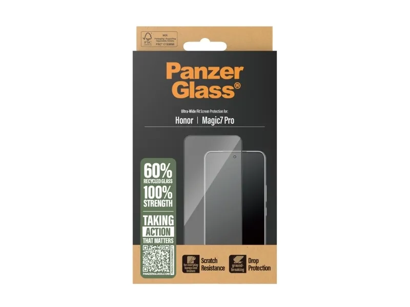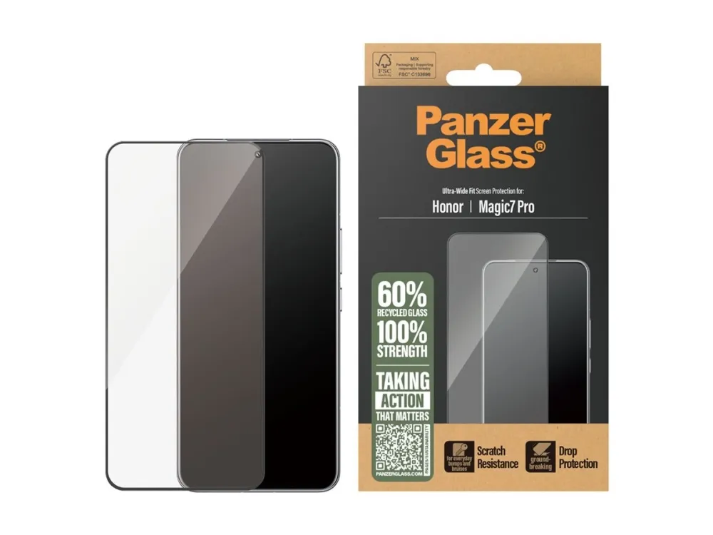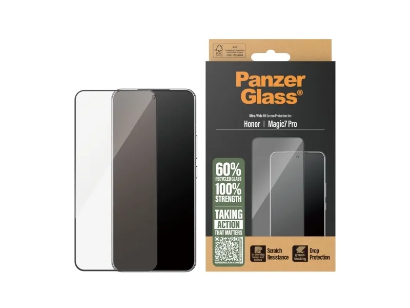 This PanzerGlass screen protector is made of 60% recycled material and provides higher scratch resistance. It even has an impressive shock-resistance capabilities and high-level drop protection, this PanzerGlass screen protector keeps your phone screen safe from accidental bumps against sharp-edged dangers, crushing falls onto stone-hard pavements and other hazards of everyday life. It also has a smudge-free coating that reduces traces of fingerprints and grease.Can it get any better? To make it even easier, we've included step-by-step instructions as well as a QR code for quick access to our online how-to video. And remember: Once the screen protection is applied, you'll never again fear the sight of your phone tumbling to the ground screen first. This may not happen, but if it does, you'll regret not having clicked "add to cart".This screen protection prolongs the lifetime of your phone so that one day you can pass it on to someone else who will love it just as much as you do. This is one way of working toward a more sustainable future. Another is to use less packaging: For this screen protector, we have managed to reduce the paper packaging by 33%* compared to previous models. So, of course, this product comes in a recyclable FSC-certified box.The screen protector is Ultra-Wide Fit, which means that it covers the front surface of your phone, providing a complete and crystal-clear view of your screen while still leaving a little room around the edges for a PanzerGlass case. If you want 360-degree phone protection, combine the screen protector and case with a PanzerGlass PicturePerfect or Hoops camera lens protector.*Measured by third-party lab by comparing the mass of the new paper packaging introduced in 2023 with the mass of the previous paper packaging introduced in 2022 (CPRTC, report No. ZSA20231301-0016).