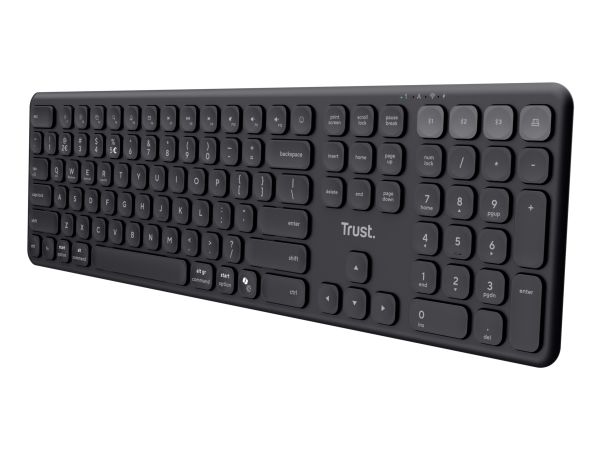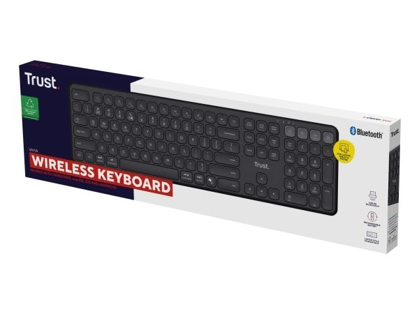 The Trust Vaiya keyboard is designed for versatility and convenience, compatible with multiple operating systems including Mac, Android, Apple iOS, and ChromeOS. Wireless connectivity through Bluetooth and 2.4 GHz technology allows for smooth and reliable communication without the hassle of cables. The full-size QWERTY layout, equipped with a numeric keypad, ensures a comfortable typing experience for work or play. With its adjustable height feature, this keyboard caters to personal comfort needs, promoting ergonomic use during long typing sessions. Built from durable ABS and PC plastic materials, the Trust Vaiya keyboard is stylish and provides long-lasting performance. Embrace the freedom of a multi-device keyboard that seamlessly switches between your connected devices, enhancing productivity in the digital workspace.