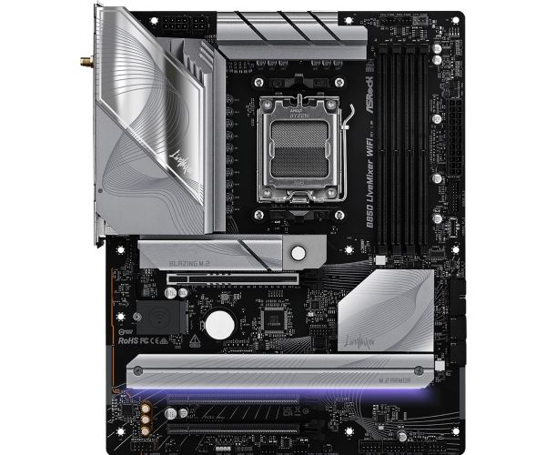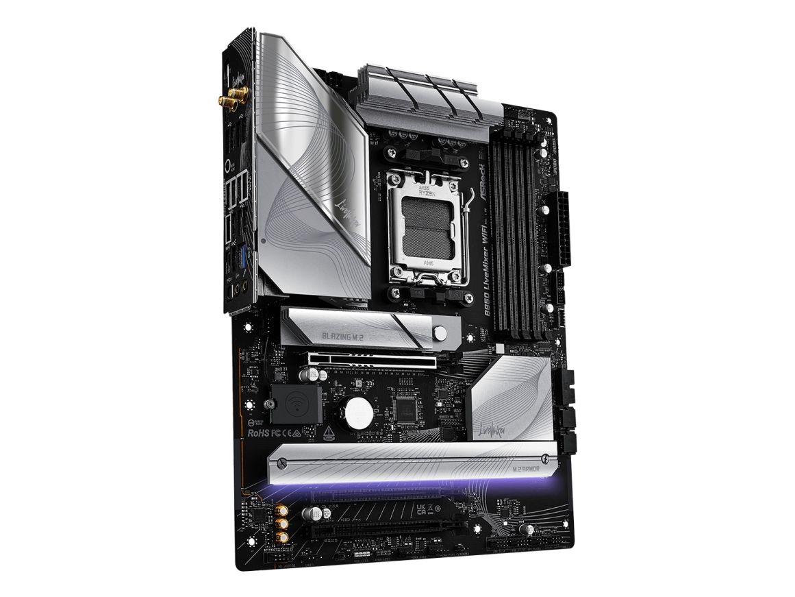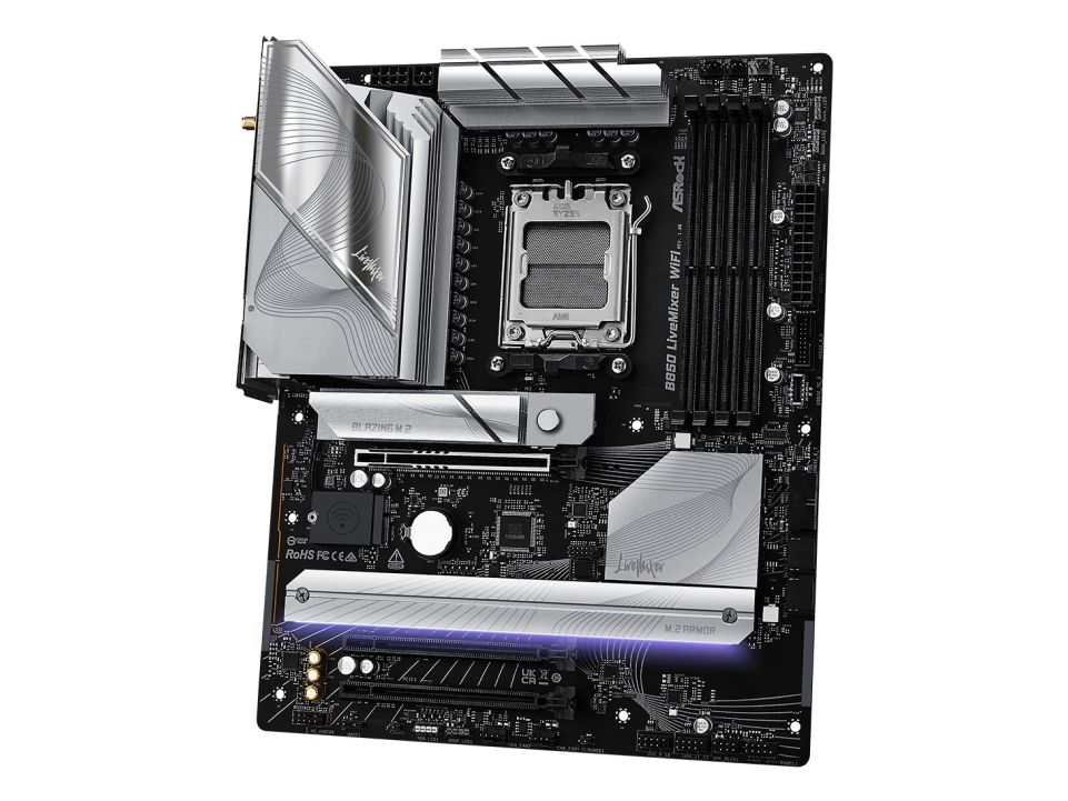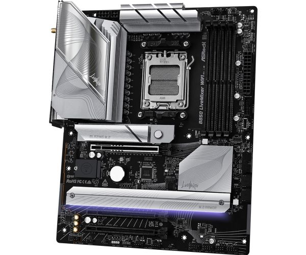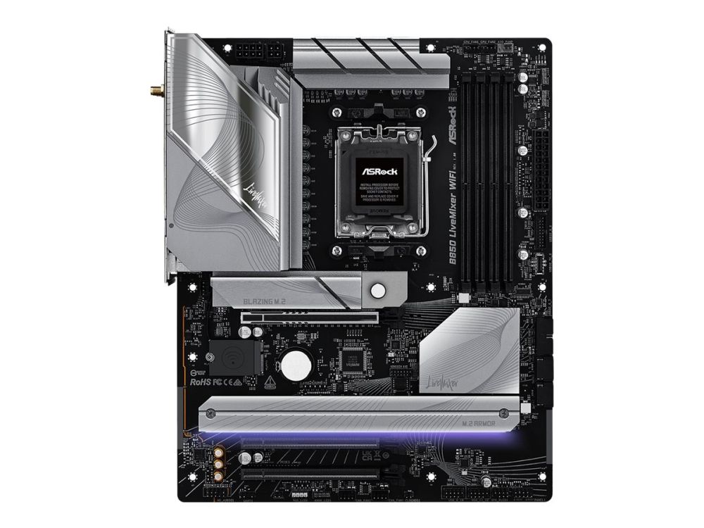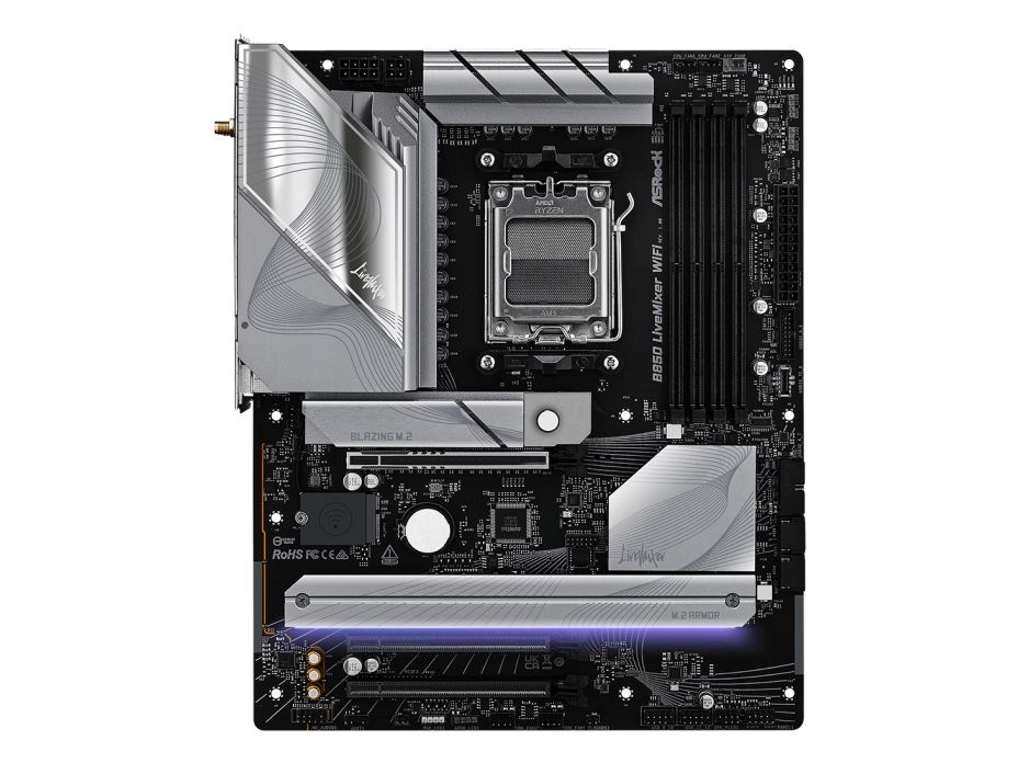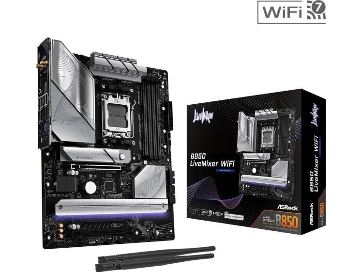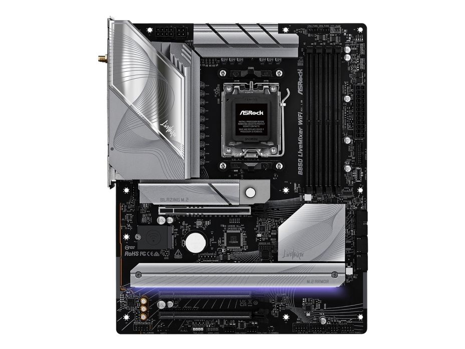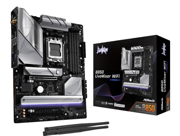 The B850 LIVEMIXER WIFI motherboard by ASRock is designed for those who demand high performance and advanced features. This motherboard supports Ryzen 7000/8000/9000 Series processors, providing a Socket AM5 for compatibility in next-generation computing. Equipped with a robust AMD B850 chipset, it supports DDR5 SDRAM with speeds of up to 4000 MHz, delivering enhanced memory performance and reliability. The layout is user-friendly, featuring 4 DIMM slots for ample memory capacity, ensuring an expedient build process with its DIY-friendly design and pre-mounted I/O shield.