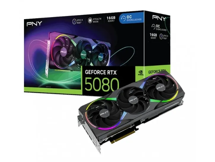 The PNY GeForce RTX 5080 ARGB OC graphics card is designed for performance and visual brilliance, meeting the demands of gamers and creators alike. With 16 GB of GDDR7 SDRAM and a bus width of 256-bit, this graphics card delivers a bandwidth of 960 GBps for seamless graphics rendering. The NVIDIA GeForce RTX 5080 features a boost clock speed of 2775 MHz and is equipped with 10752 CUDA cores, ensuring speed and responsiveness for intensive tasks such as gaming and 3D rendering. Its support for resolutions up to 7680 x 4320 makes it suitable for ultra-high-definition displays, while the ability to drive up to 4 monitors simultaneously enhances multi-tasking capabilities. The PNY GeForce RTX 5080 boasts advanced features like NVIDIA DLSS 4, 4th gen Ray Tracing Cores, and 5th gen Tensor Cores, providing realistic shading and lighting effects for immersive experiences. The three-fan design enhances cooling efficiency, ensuring the card operates smoothly even under heavy load. For additional aesthetic appeal, the ARGB lighting offers customizable options, allowing users to personalize their setup. With support for DisplayPort 2.1b and multiple output options, this graphics card is versatile enough to accommodate a wide range of display configurations, making it a solid choice for computing demands.