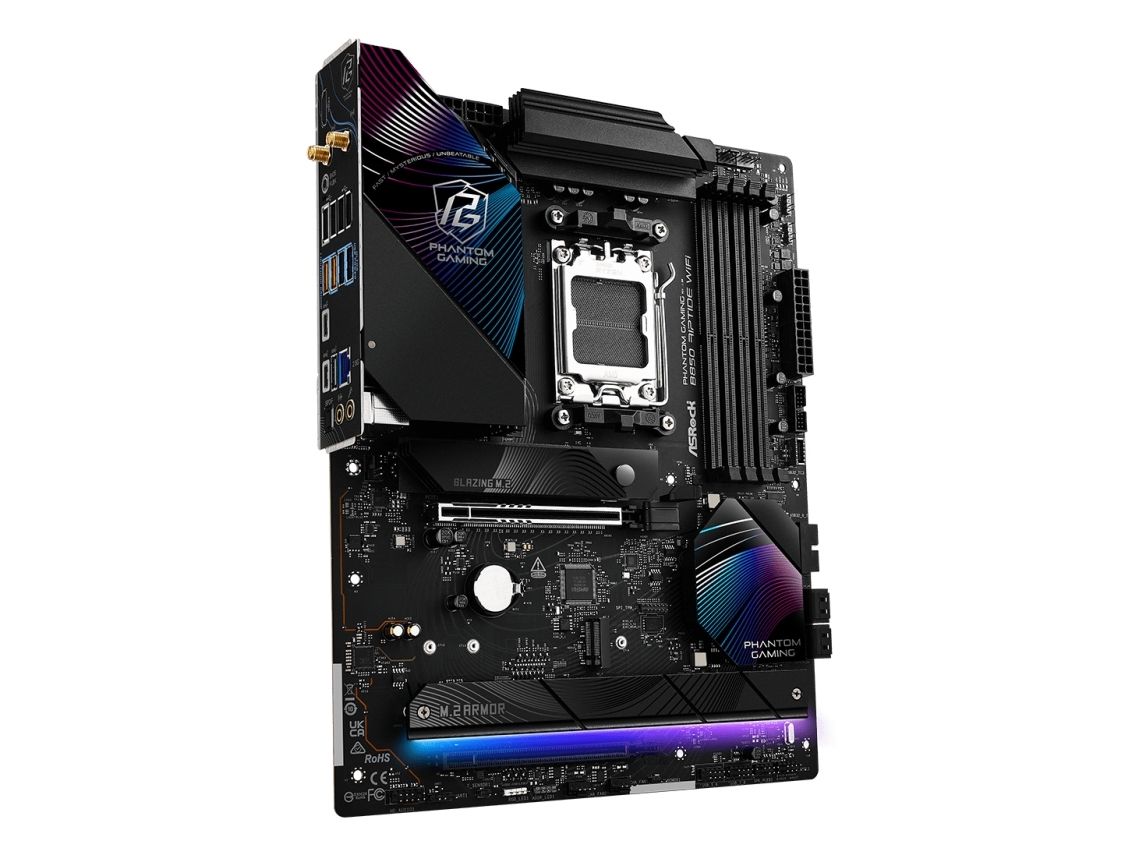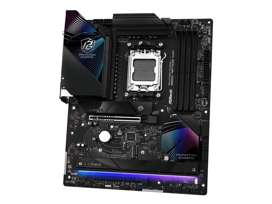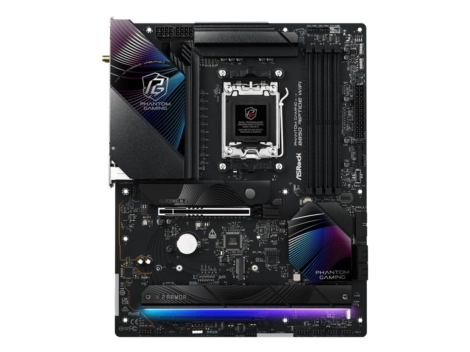 The ASRock Phantom Gaming B850 Riptide WiFi motherboard is engineered for immersive gaming experiences and high-performance computing. Designed with compatibility for Ryzen processors, this motherboard supports DDR5 RAM technology, enabling faster data transfer rates with speeds up to 8000 MHz (O.C.). The board's robust 14+2+1 phase power design ensures efficient power delivery, while its dual-channel memory architecture enhances system responsiveness and multitasking capabilities. Incorporating advanced connectivity options, the B850 Riptide WiFi features USB 3.2 Gen 2 and USB-C 3.2 Gen 2x2 ports for high-speed data transfer. Network connectivity is improved with 2.5 Gigabit Ethernet and Wi-Fi 7 support, allowing for seamless online interactions and gameplay. The board enables high-definition audio output with an 8-channel audio codec, setting the stage for an engaging audio experience, whether gaming or streaming media. The effective cooling solutions and DIY-friendly design provide users with the flexibility to maximize their system's capabilities.