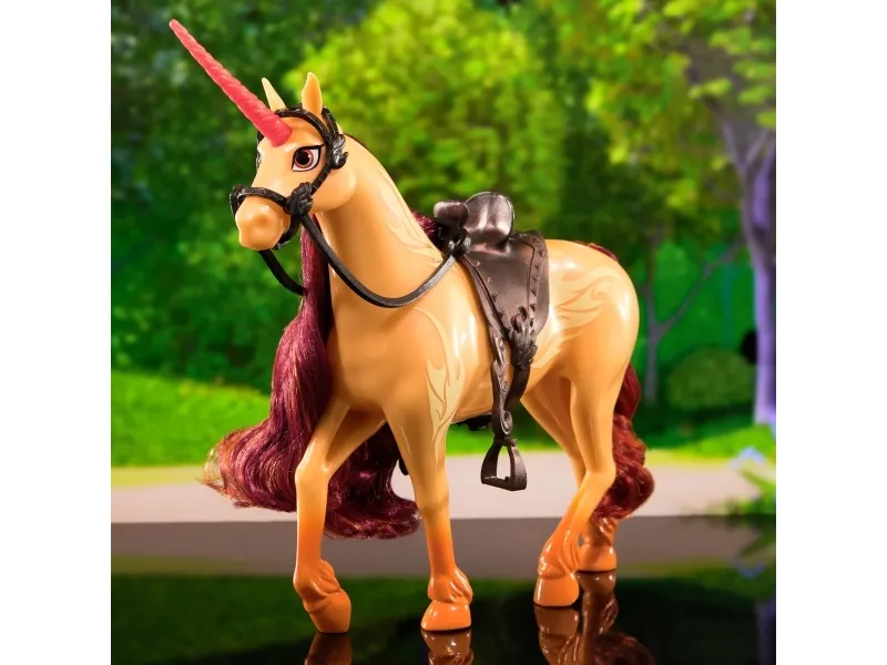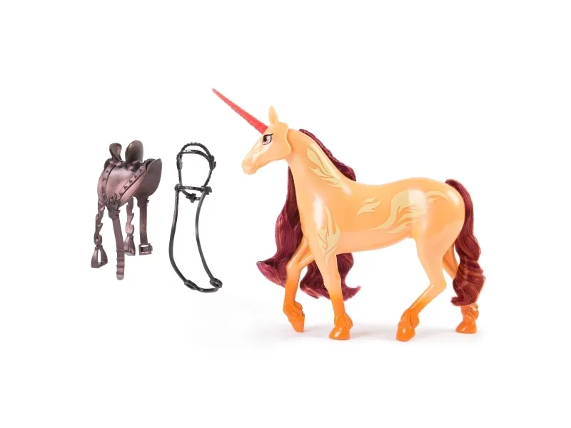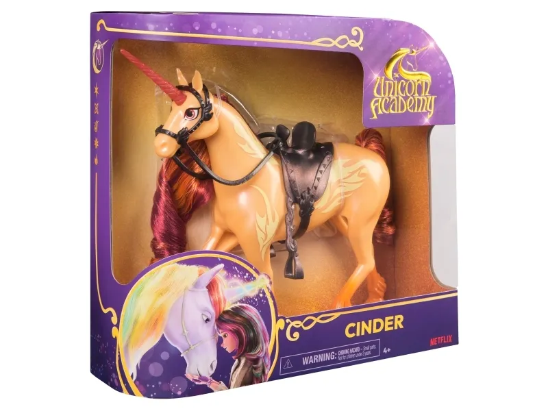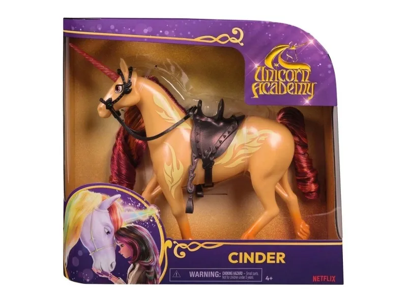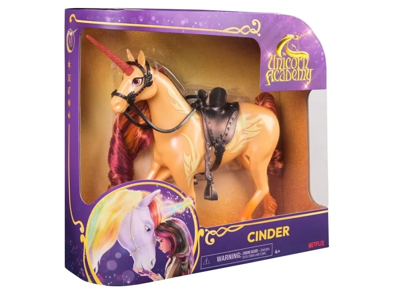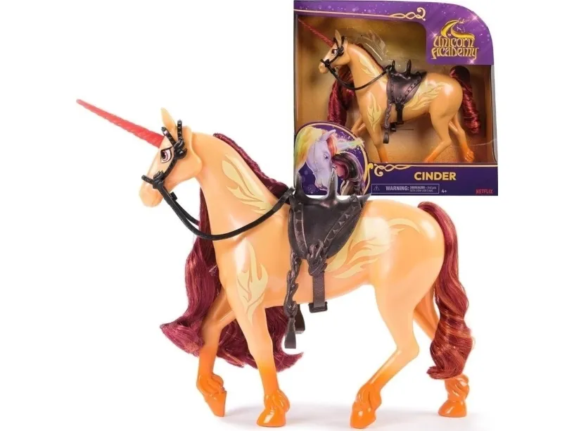 Complete your Unicorn Academy doll collection with Valentina’s unicorn, Cinder. Inspired by the NETFLIX animated show and best-selling book series where friendship reins, this 11-inch unicorn toy brings fiery Cinder to life. Beautifully detailed, Cinder features a pearlized body, yellow Fire Magic markings on his side, a majestic glittery horn, colorful mane and tail, and removable bridle and saddle doll accessories for added play. Gently move Cinder’s head to bring out his personality and relive the magical bonding experience between unicorn and rider with Valentina. Brush Cinder’s soft mane and tail with Valentina’s styling tool (not included, sold separately with doll) and ride into adventure to protect Unicorn Island and its magic. For more ways to experience Unicorn Academy with your favorite characters, look for all of the rider dolls and their unicorns (each sold separately) and expand your world. The magical bonds between Unicorn Academy students and their unicorns will spark endless imaginative storytelling. For kids who enjoy unicorns and horse toys, dolls & accessories, doll house play, collectibles, plush toys and more, Unicorn Academy toys are fun birthday gifts for girls or gifts for any occasion. Bring home the magic of Unicorn Academy with Cinder.