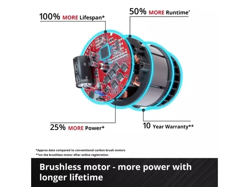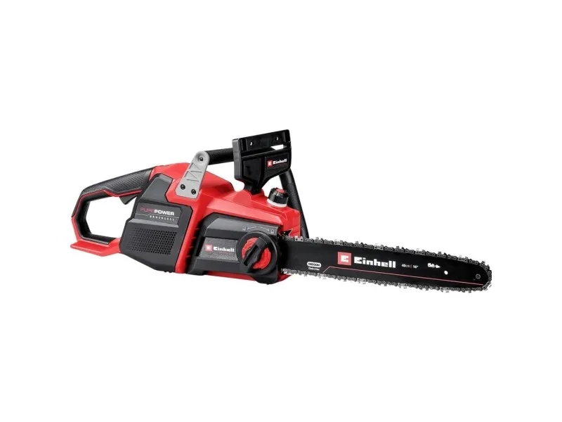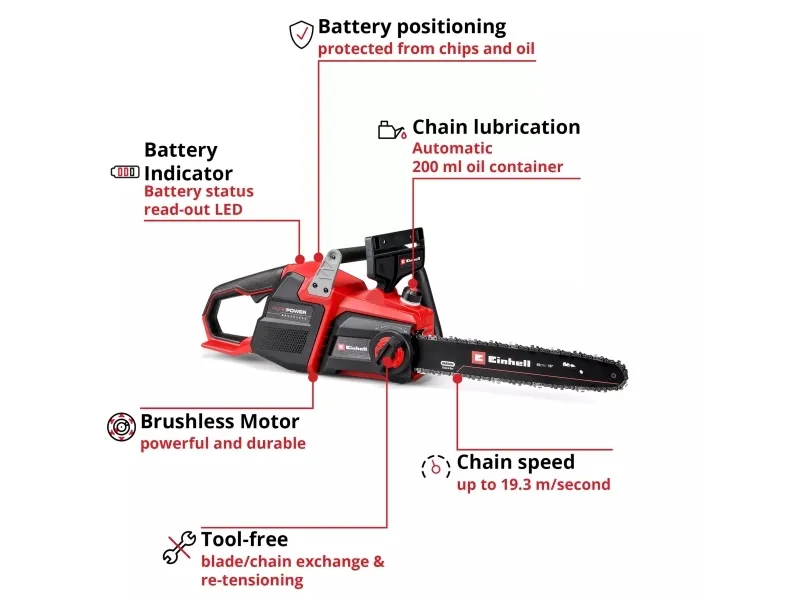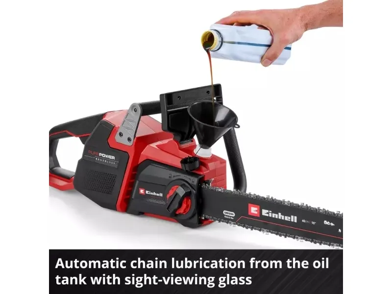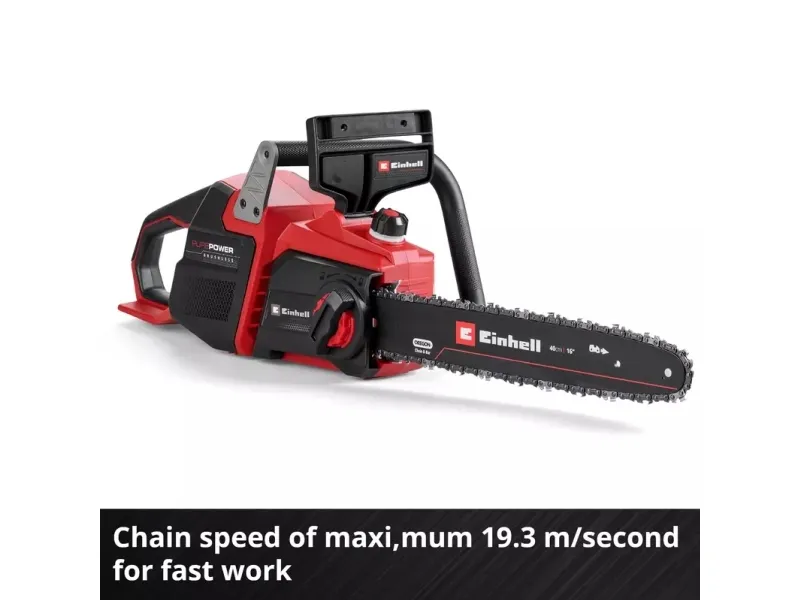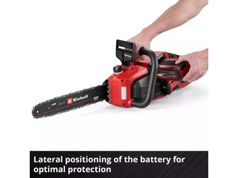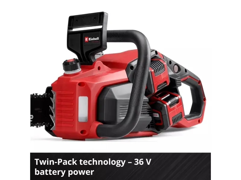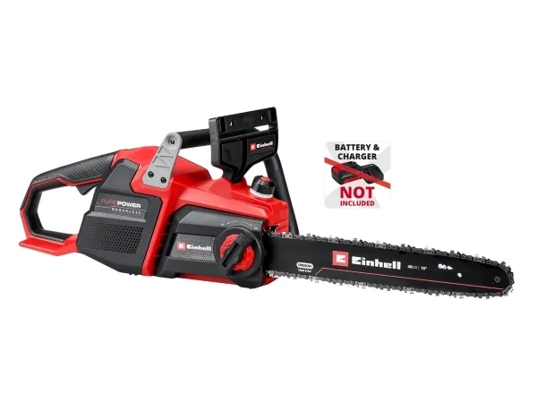 Member of the Power X-Change family, 2x 18 V battery required Twin-Pack technology: 2x18V Power X-Change batteries - more power Brushless motor - more power and longer running time PurePOWER Brushless - 10-year motor warranty after registration Toolless chain tensioning and changing High-quality OREGON guide bar and sharp chain Perfectly balanced battery positioning Side positioning of the battery for optimal protection Automatic chain lubrication LED battery charge indicator for monitoring battery capacity Ergonomic handle with softgrip Sturdy stop claws made of metal Oil tank with gauge glas for automatic chain lubrication Kickback guard and instant chain brake Chain catcher for user protection Recommendation for optimal results: 2x 5.2 Ah battery or larger Delivery without battery and charger (available separately) Supplied without battery and charger (sold separately) Sword length: 400 mm Max. cutting length: 38 cm Chain cutting speed: 19 m/s Oil tank capacity: 230 mL