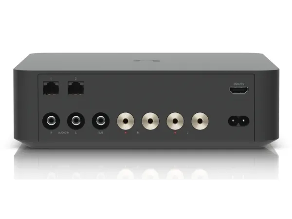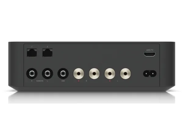 Ljudingång (vänster) (RCA) - bak Ljudingång (höger) (RCA) - bak Utgång för bashögtalare (RCA) - bak 2 x ljudutgång (banan x 2) - bak 2 x nätverk (RJ-45) - bak HDMI-eARC (19 pin HDMI typ A) - bak