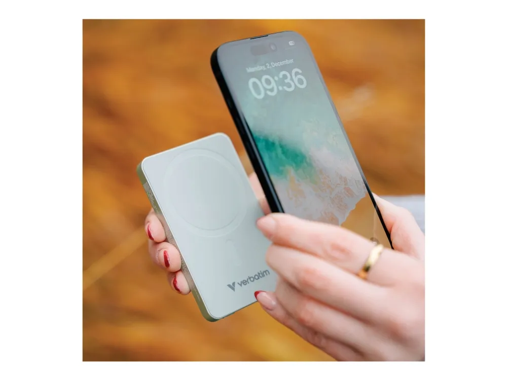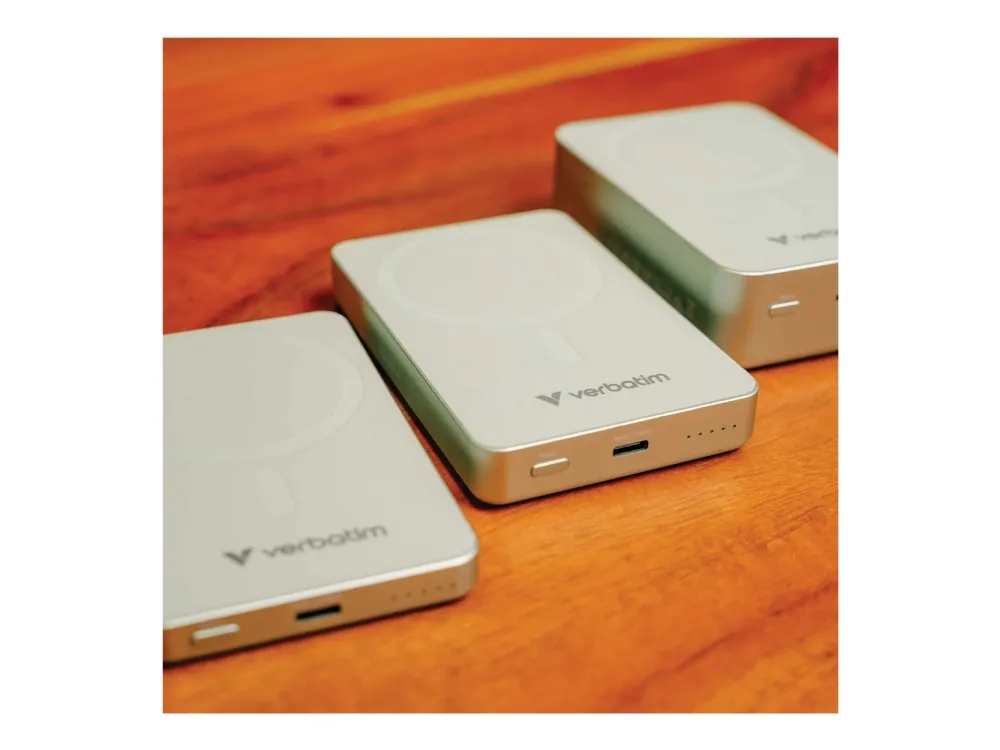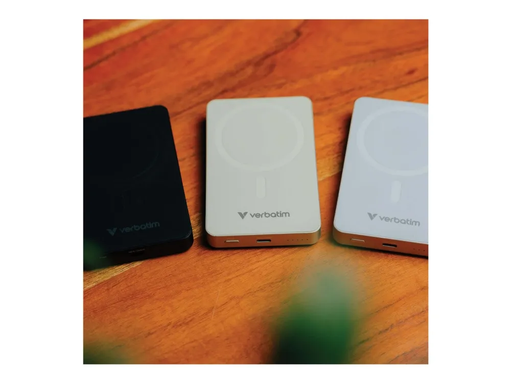 The Verbatim Charge 'n' Go Essentials is a wireless power bank designed for cellular phones, featuring a 10,000 mAh battery capacity. This device provides magnetic fast charging and includes multiple fast charge technologies such as Apple Fast Charge, Power Delivery 3.0, and Qualcomm Quick Charge 3.0. With an output power of up to 20 W, it ensures quick recharging for devices, making it an accessory for those on the go.