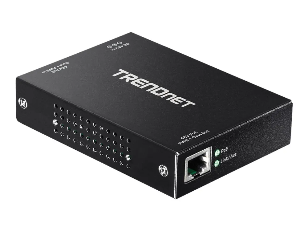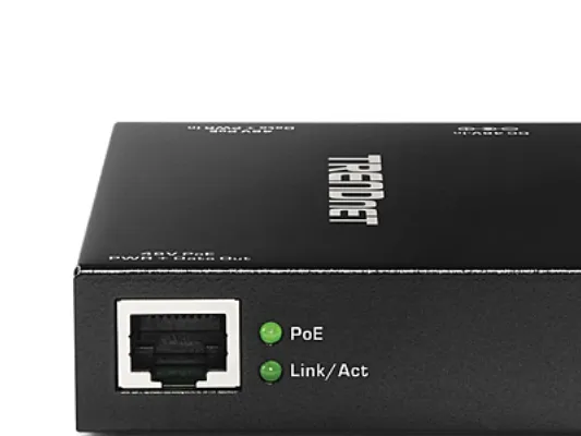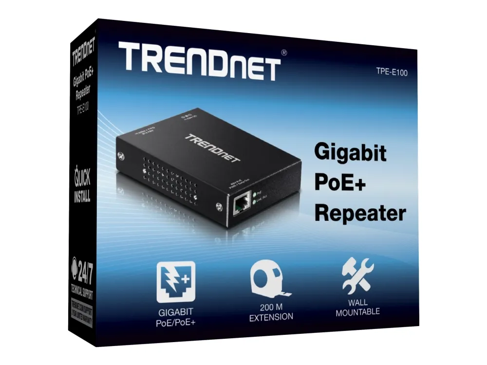 TRENDnet's Gigabit PoE+ extender, model TPE-E100, takes a single PoE+ connection and extends it an additional 100 m (328 feet) for remote PoE/PoE+ device installation. The PoE Extender auto-detects a PoE (15.4 W) or PoE+ (30 W) connection and extends it for a total distance of up to 200 m (656 feet) from the PoE+ power source equipment. The TPE-E100 features a convenient wall mountable design for installation flexibility. Daisy-chain up to 3 units for a total PoE+ network extension of 400 m (1312 feet).