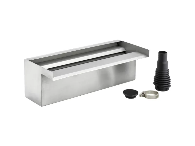 och elegant vattenfall i 300 mm bredd. Individuella vattenfall kan enkelt utformas eftersom det robusta och högkvalitativa utförandet i rostfritt stål tillåter både montering i en vägg och fastsättning på en vägg. Nu med förlängd ränna för ännu enklare installation. Gängade öppningar, slangmunstycken och plugg ingår. Den passande pumpen säkerställer ett klart och regelbundet vattenfall: vid en vattenfallshöjd på 0,8 m - 1,0 m = AquaMax Eco 3500 - 4000/0,4 m - 0,6 m = AquaMax Eco 2500/0,2 m = AquaMax Eco 2500.