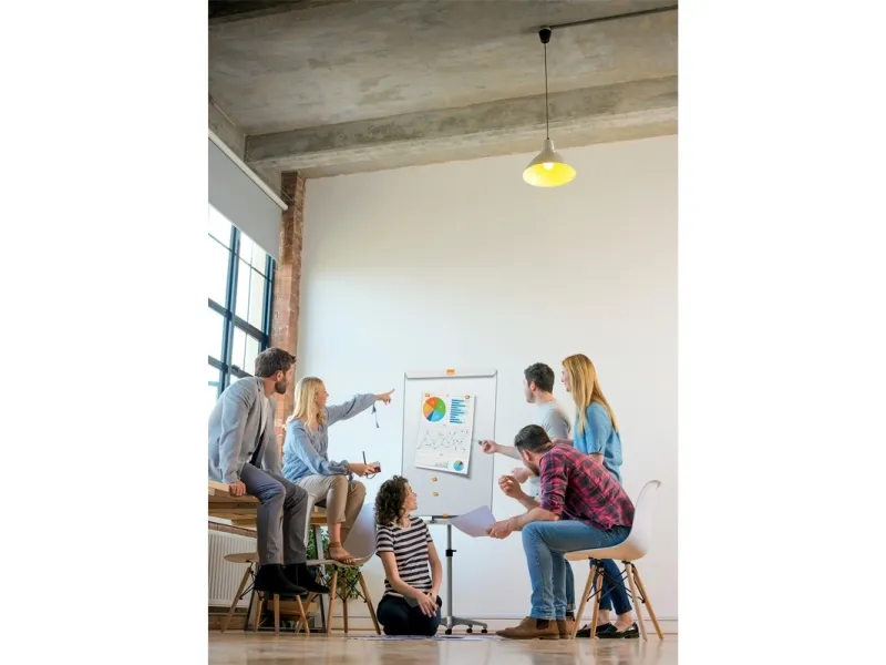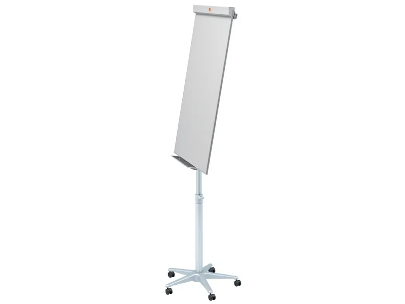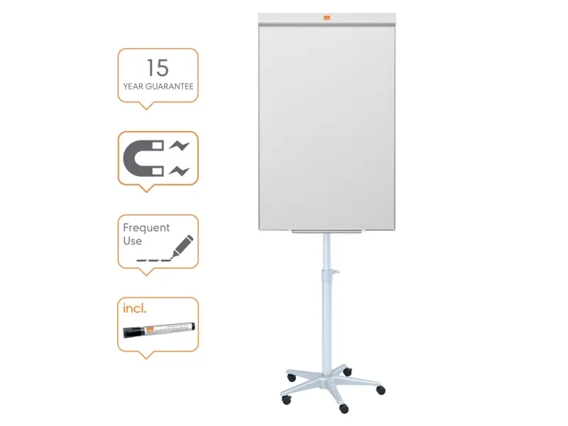 The versatile Barracuda Easel gives you a sleek and stylish mobile flipchart and magnetic drywipe writing board in one. It’s a great combination for everyday office meetings as well as brainstorming sessions and is ideal for any professional environment from offices to training suites or hotel conference rooms.\n\nFlipchart easel: the oversized whiteboard (1000 x 700mm) can accommodate all standard sizes of flipchart pad. The flip-up paper clamp makes pad changing quick and easy and features sliding pad hooks, making the easel suitable for most flipchart formats.\n\nThe full-width, metal pen tray ensures you always have a range of colours to hand and the height-adjustable base is set on 5 heavy duty castors for easy manoeuvring between offices or meeting rooms. 3 of them lock for maximum stability when the easel is in use.\n\nMagnetic drywipe board: run out of flipchart paper? That’s no problem, simply use special drywipe pens to write extra notes direct on the drywipe board, or attach diagrams, photos and charts – or a combination of the two. The board’s magnetic surface makes it easy to secure printed sheets (magnets available separately) to create eye-catching presentations.\n\nThe hard-wearing surface is scratch and chip-resistant, making the Barracuda Mobile Magnetic Flipchart Easel ideal for heavy-duty use.\nWith a good monthly clean using board renovator, the surface will remain in tip-top condition with no grease or ghost images, ensuring you communicate a clear, professional message time after time.