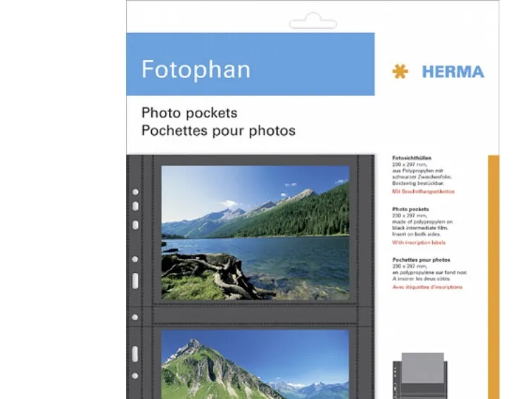 - Transparent photo pockets welded to both sides of the backing sheets. For clear archiving and filing, with Euro-standard holes for all current files and ring albums. Made of photo-friendly, absolutely plasticizer-free polypropylene film. Proven safety - no chemical influence to photos.