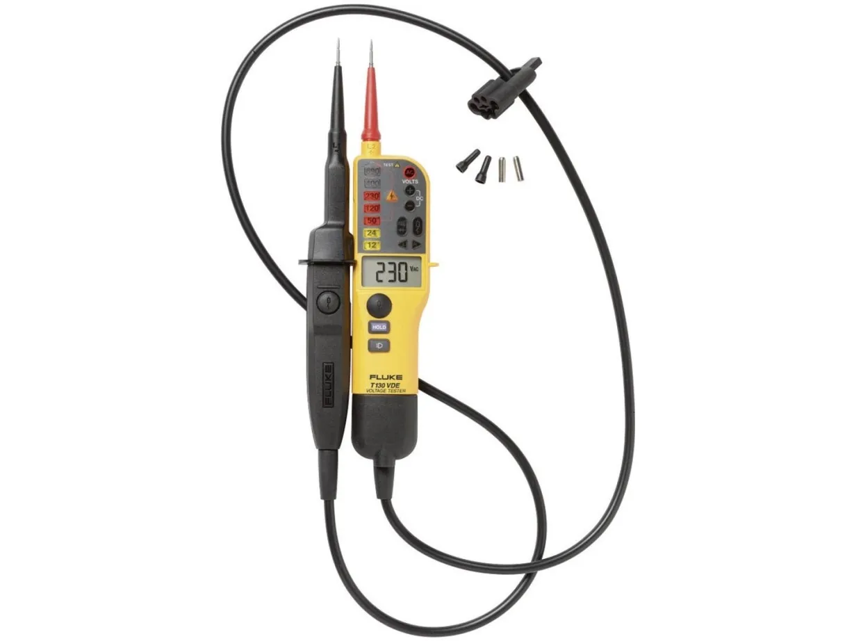Spændings- og gennemgangstester Fluke T130 VDEDen nye spændings- og gennemgangstester fra Fluke gør dit arbejde langt nemmere. Man får en optimal kombination af sikkerhed, betjeningskomfort og direkte tilbagemeldinger i alle driftssituationer.Den nye familie af to-polede spændingstestapparater fra Fluke har en sikkerhedsspecifikation i henhold til Cat IV 600 V, Cat III 690 V og opfylder sikkerhedsforskrifterne HSE GS 38 (målespidser) og IEC EN 61243-3.Der er fire muligheder for registrering af veksel-/jævnspænding: En klar visning af status og måleværdier med LED, visning af måleværdien på det klare digitaldisplay, gennemgangstest med akustisk signal og en vibrationsgiver, som giver en mærkbar tilbagemelding (vibrationsgiver i T110 VDE, T130 VDE, T150 VDE).Måleværdivisning med baggrundsbelysningMærkbar tilbagemelding via vibrationsgiver (T110 VDE, T130 VDE, T150 VDE)Batterispændingsvisning.Spændingsregistrering, selv ved afladede batterierForbedret optagelse af målespidserne til sikker opb