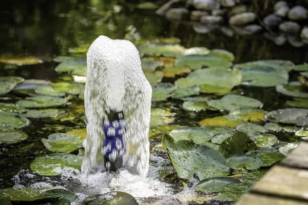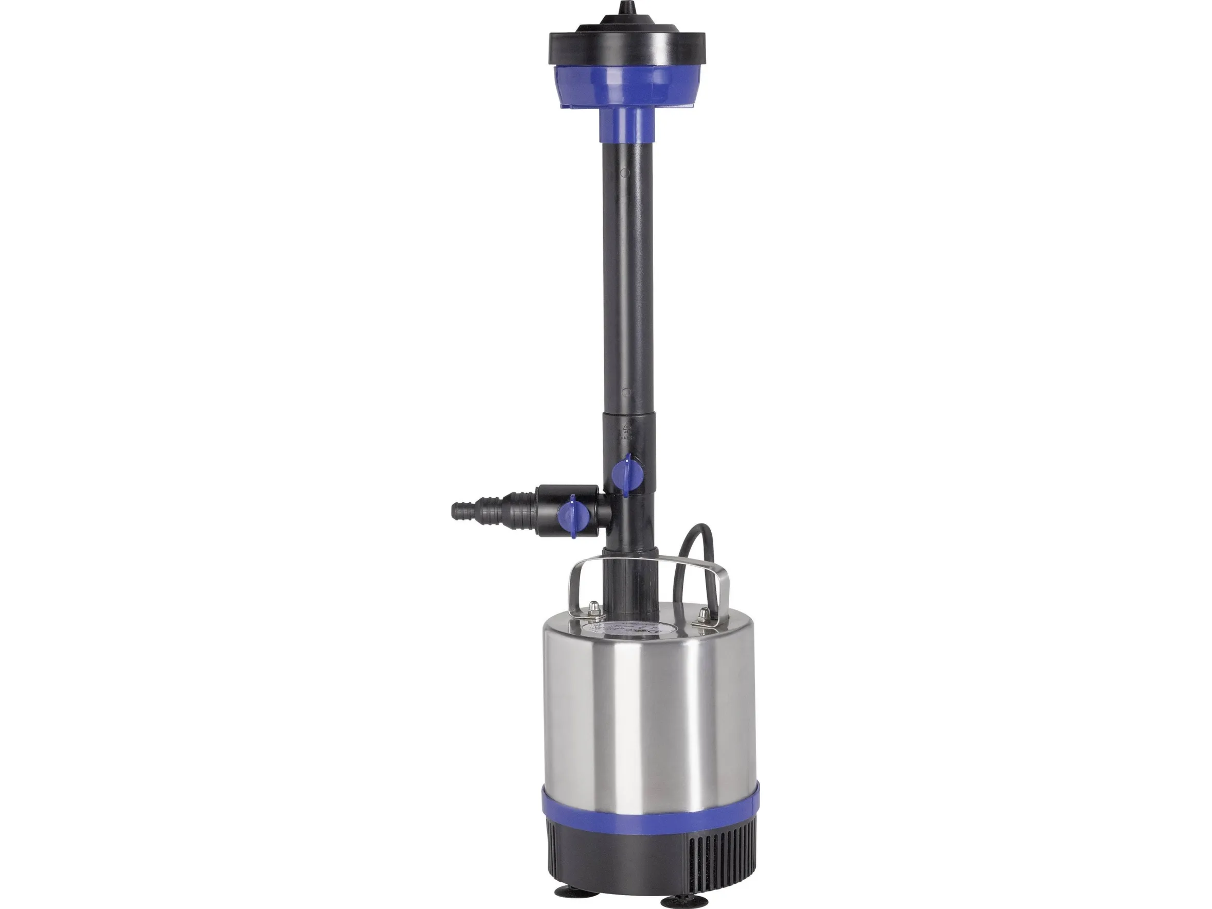 Fontänpump i rostfritt stål 120 W 2-vägsfördelare med kulventil för justering av flödeshastigheten - Muttrar till sughuvudet - Avtagbar filterinsats. Med pumphuvud i rostfritt stål av hög kvalitet. Möjlighet till 3 vattenmönster (skumspray och 2 fontäner). Pumphjulet drivs av en magnetkoppling (ingen tätning krävs). Maximal kapacitet 3000 l/h