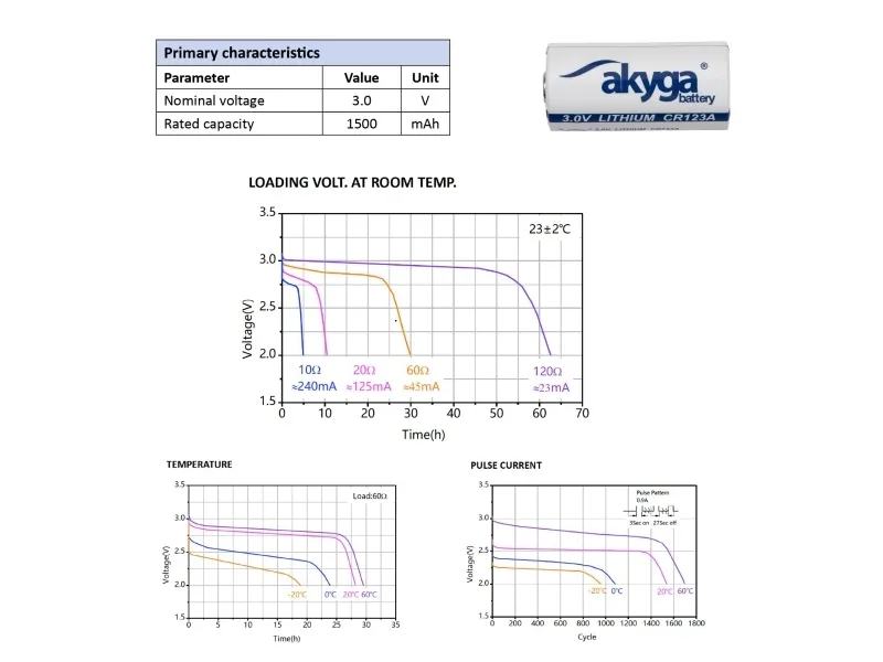 Akyga - Batteri - 3V, för 85°C CR123A - Li/MnO2 - 1500 mAh
