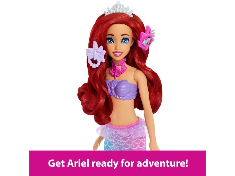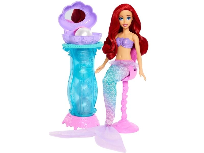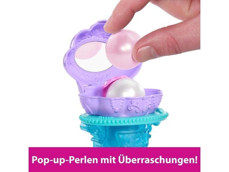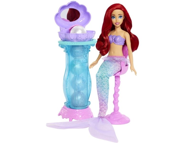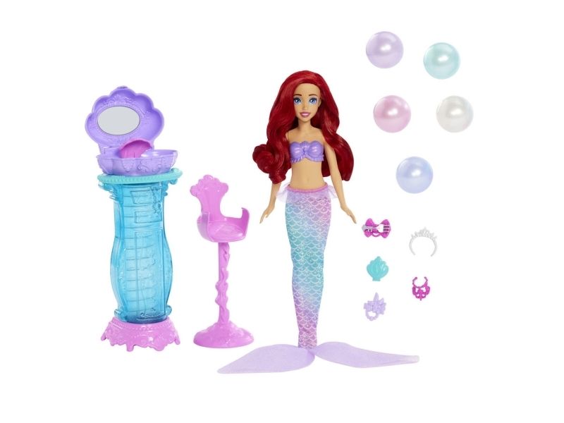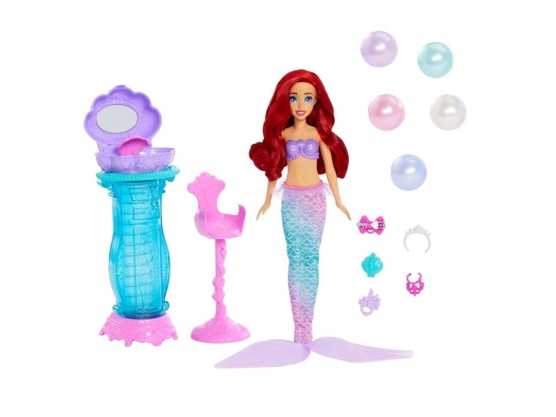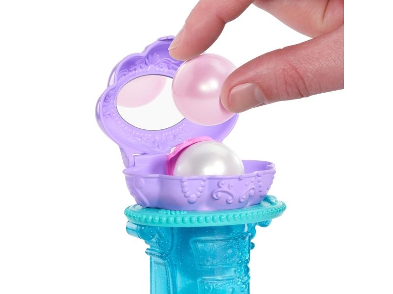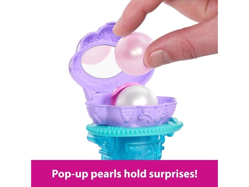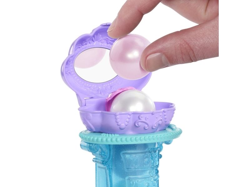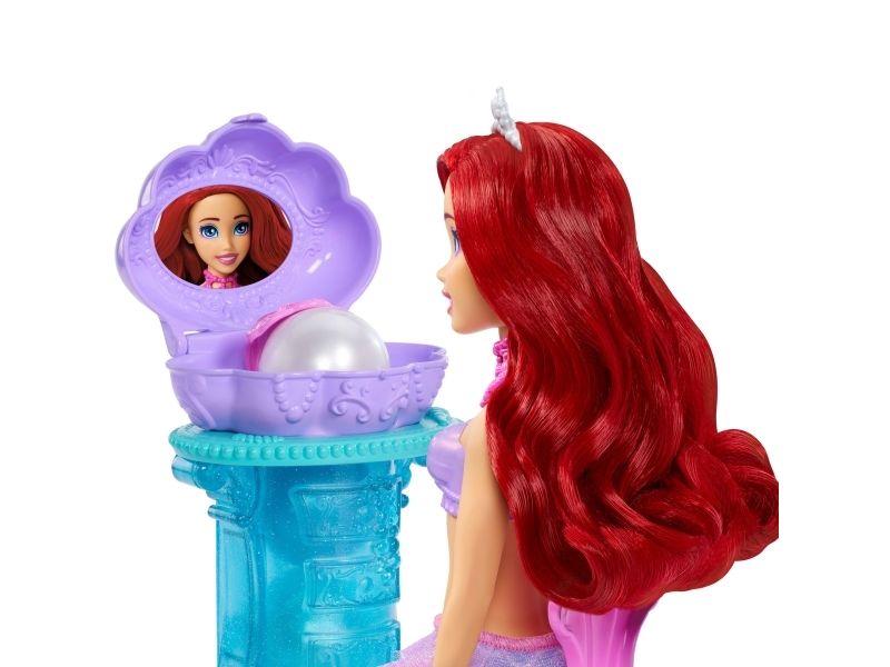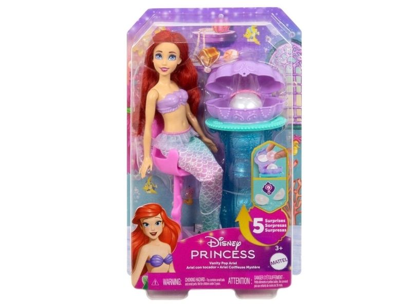 Mermaid magic never ends with Vanity Pop Disney Ariel! Inspired by Disney's The Little Mermaid, fashion doll Ariel can get ready for adventure with her vanity containing 5 surprise-filled "pearls" inside. Open the top of the vanity, and a pearl containing a surprise accessory pops up! Remove the pearl to reveal the treasure inside, and another pearl pops up to take its place. Vanity can be refilled for repeated play, and kids can use the vanity, mirror and accessories to get Ariel doll ready for adventures on land and sea. Doll cannot stand alone. Colors and decorations may vary.