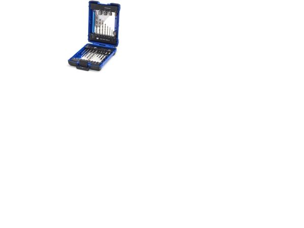 THÜRMER TOOLS Kombibox. Med borrkronor för metall i storlekarna 2-8 mm, för trä i storlekarna 3-8 mm och för vägg i storlekarna 4-8 mm. Innehåller även spetsar med batteri och borrkronor.